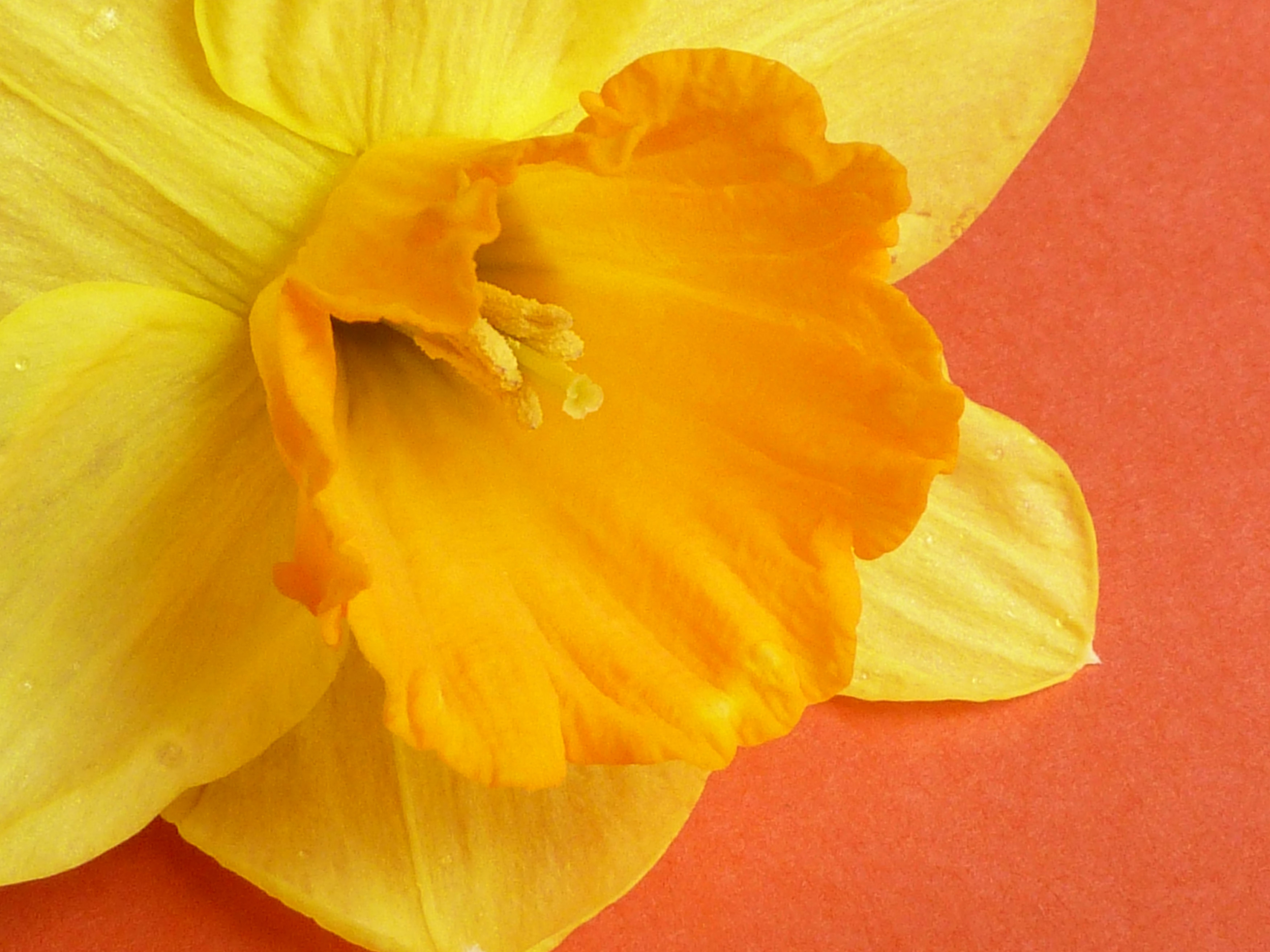 Close up on the colorful corona of a yellow spring daffodil over an orange background conceptual of the seasons