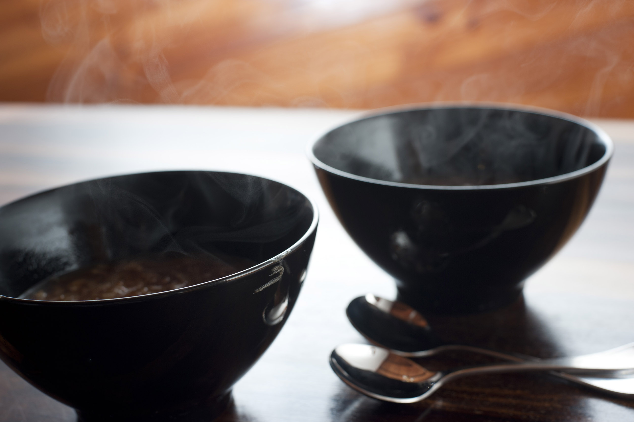 Photo Title: Two bowls of steaming hot onion soup