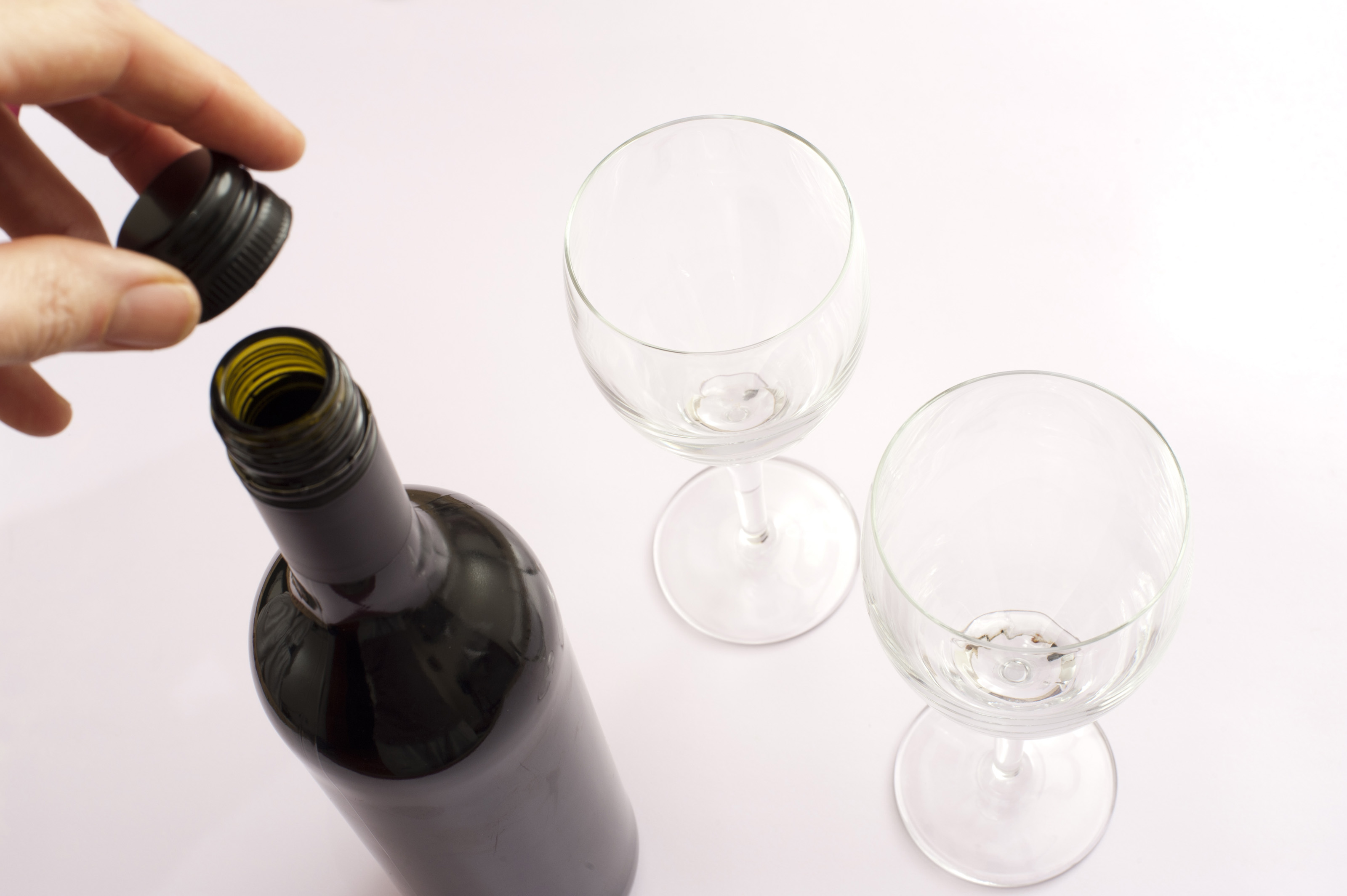 Keywords: red wine, opening, open, screw top, cap, removed, opened, glasses, wine water, white, on white, empty