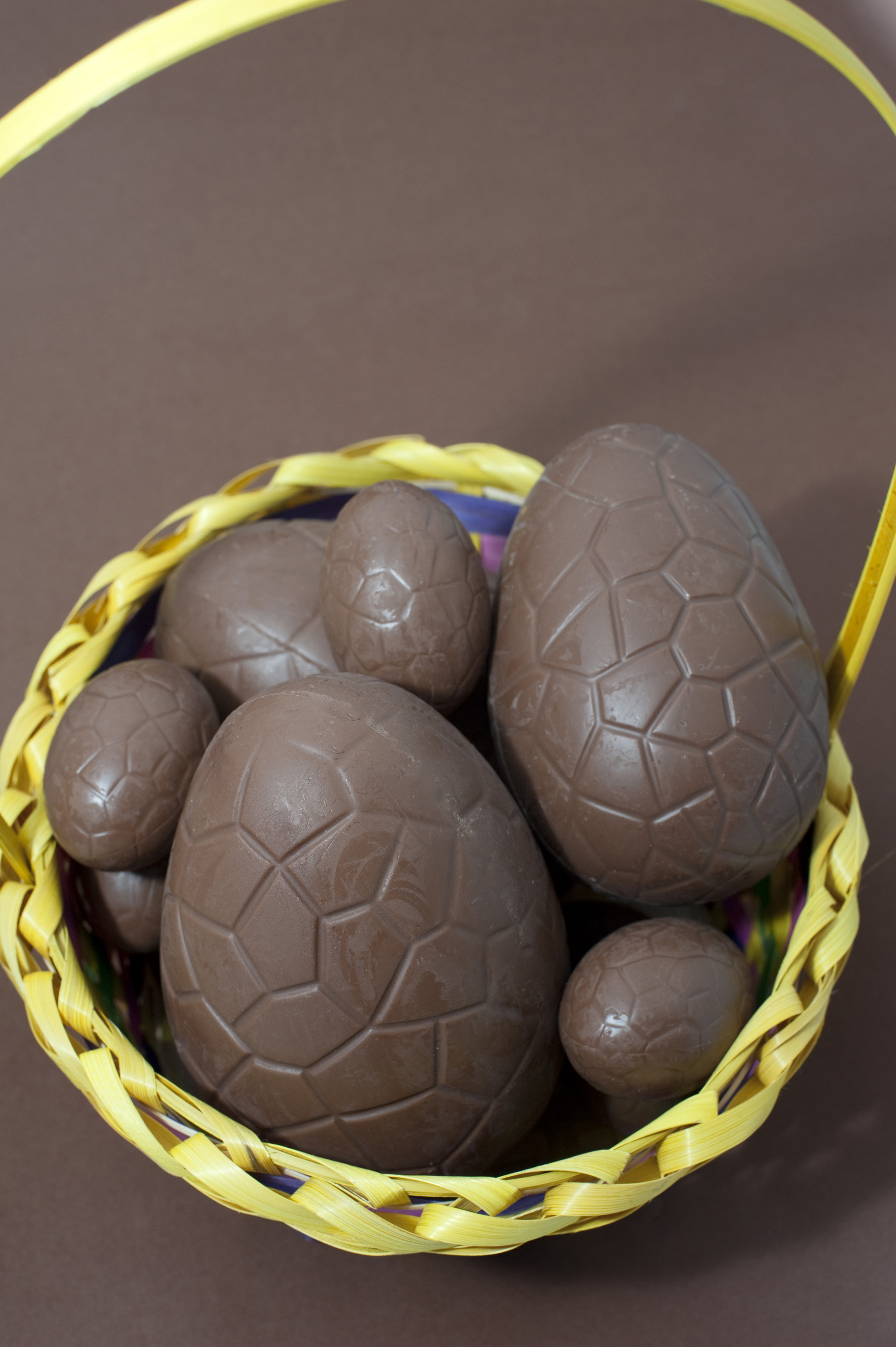 Keywords: brown, background, holiday, celebration, sweet, candy, chocolate, collection, egg, easter, basket, sizes, confectionery, milk chocolate, unwrapped