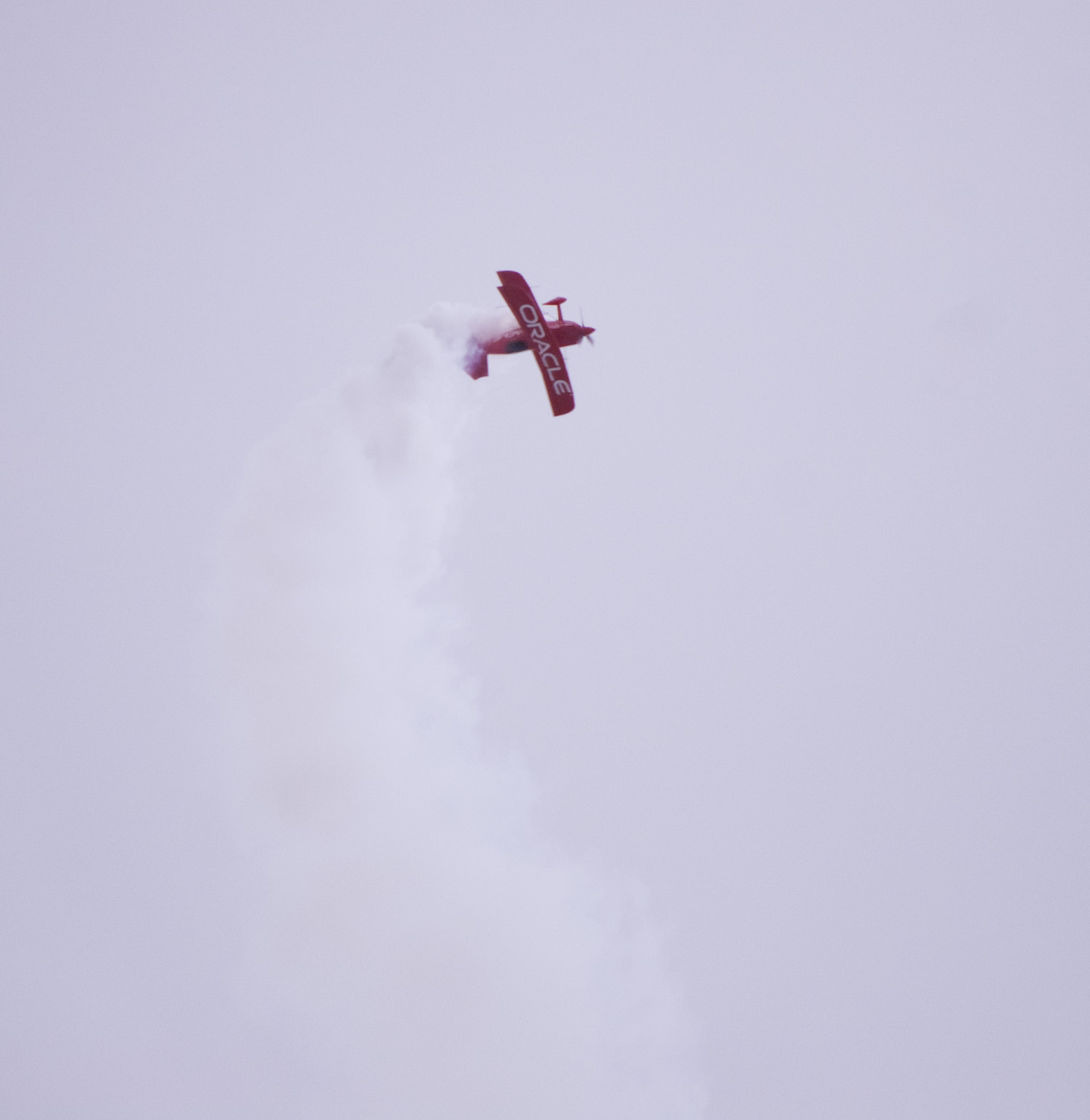 editorial use only: a small red biplane performing a stunt display at an airshow