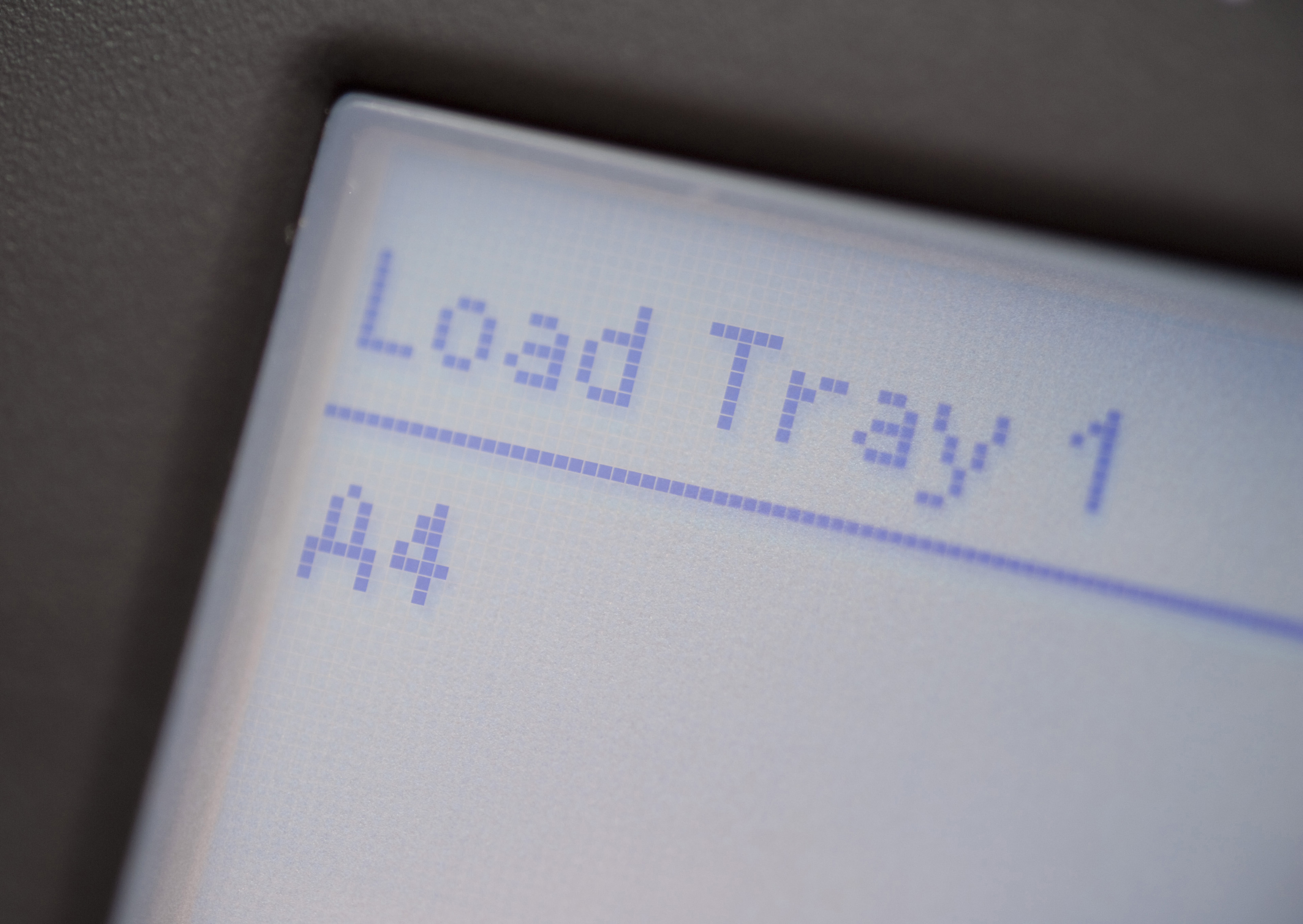Load Tray message and digital display on an office printer or copier indicating that the paper has run out