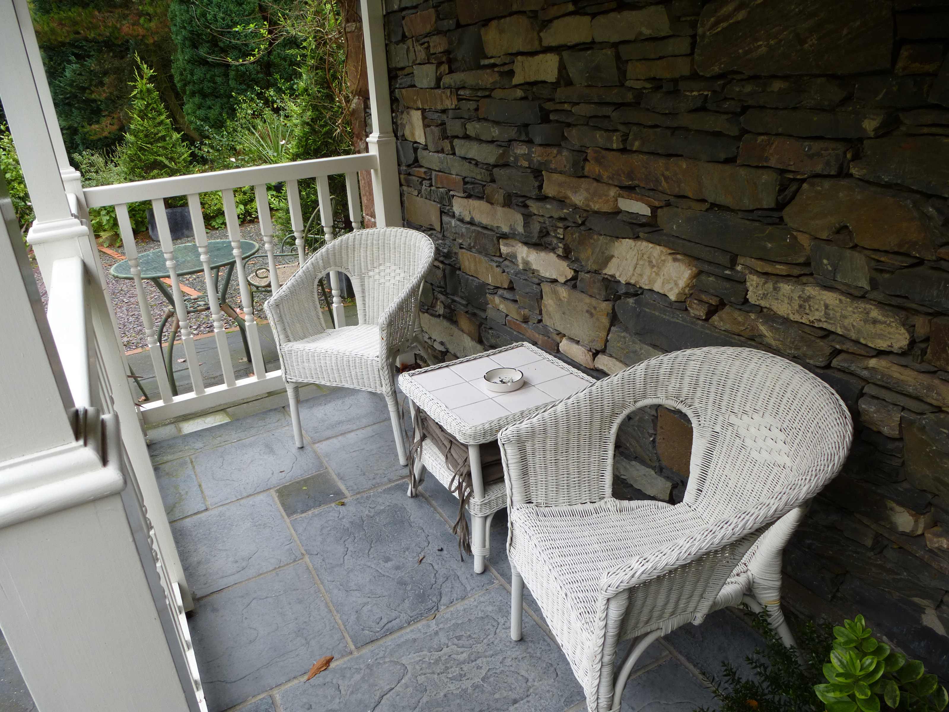 Keywords: garden, enclosed, furniture, house, patio, porch, railing, relaxation, seating, stone, table, wall, white, wicker, wickerwork