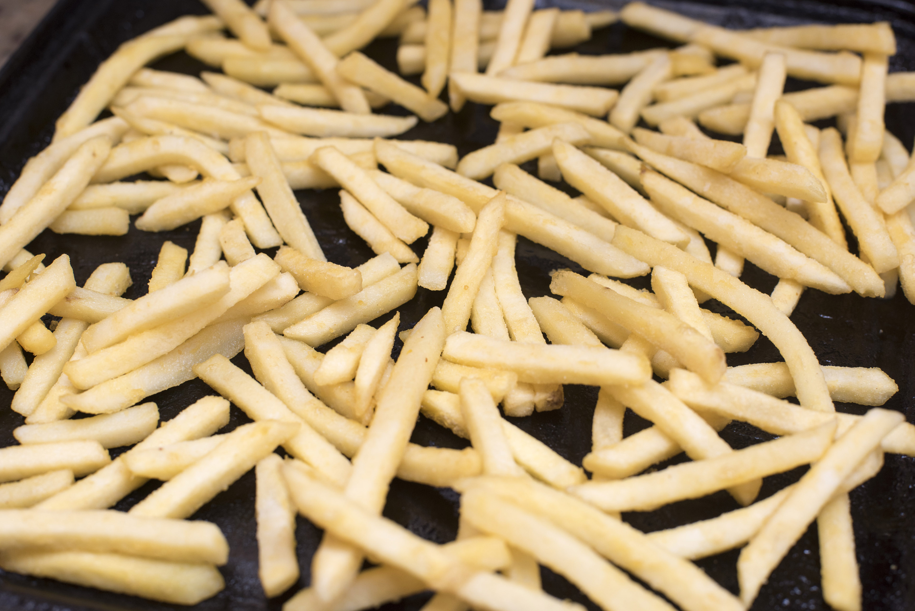 Photo Title: Close up of frozen potato chips in oven tray