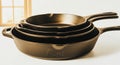 Stack of three metal non-stick kitchen pans or cookware with handles over a light grey background viewed high angle