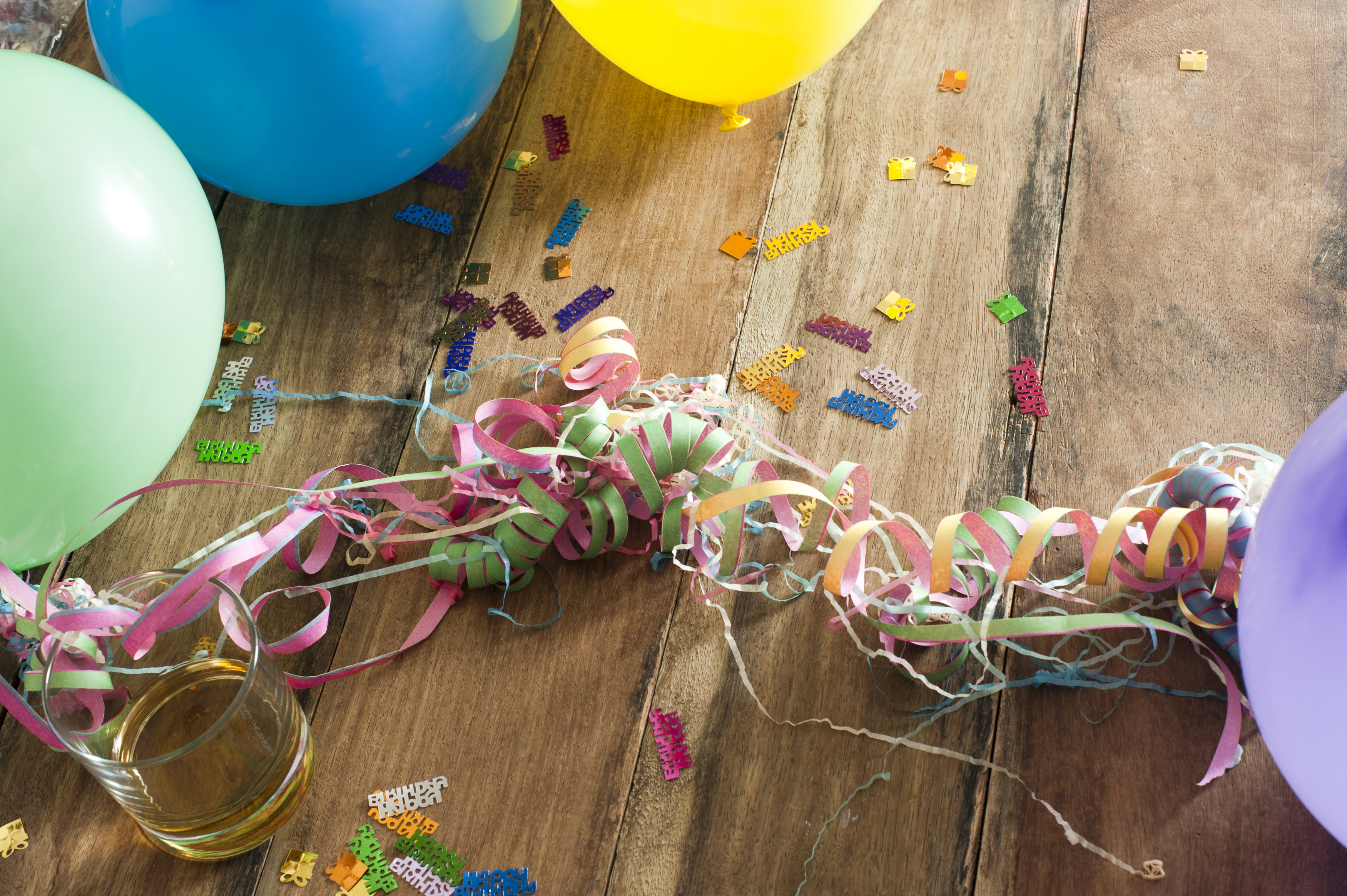 Keywords: balloons, birthday, celebration, confetti, festival, festive, holiday, new year, party, sprinkles, streamers, table, wooden, copyspace, decorations, mess, afterwards, aftermath