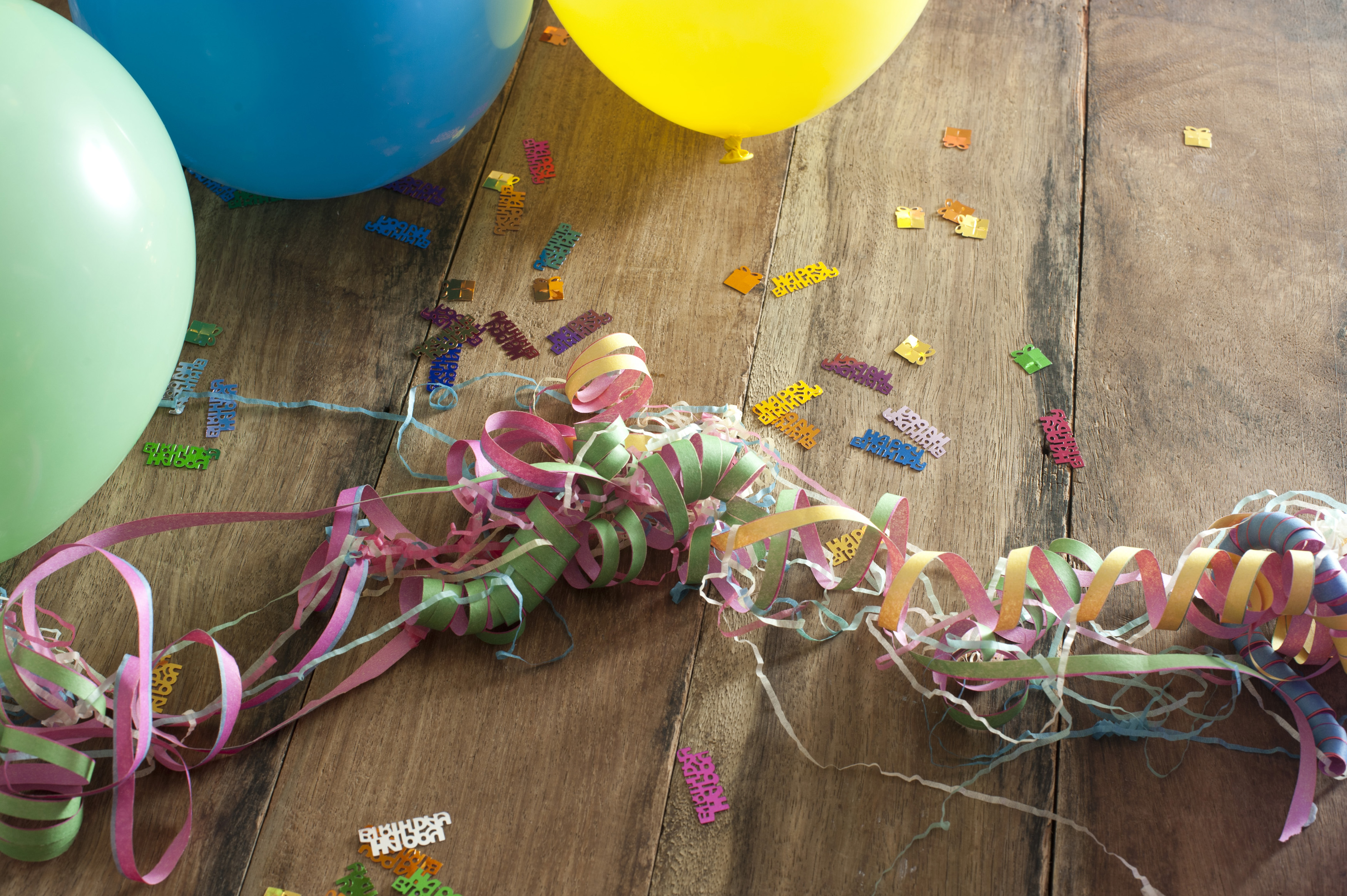 Keywords: birthday, celebration, confetti, party, ribbons, streamers, table, wooden, decorations, balloons, festive, mess, curled, tangled, background