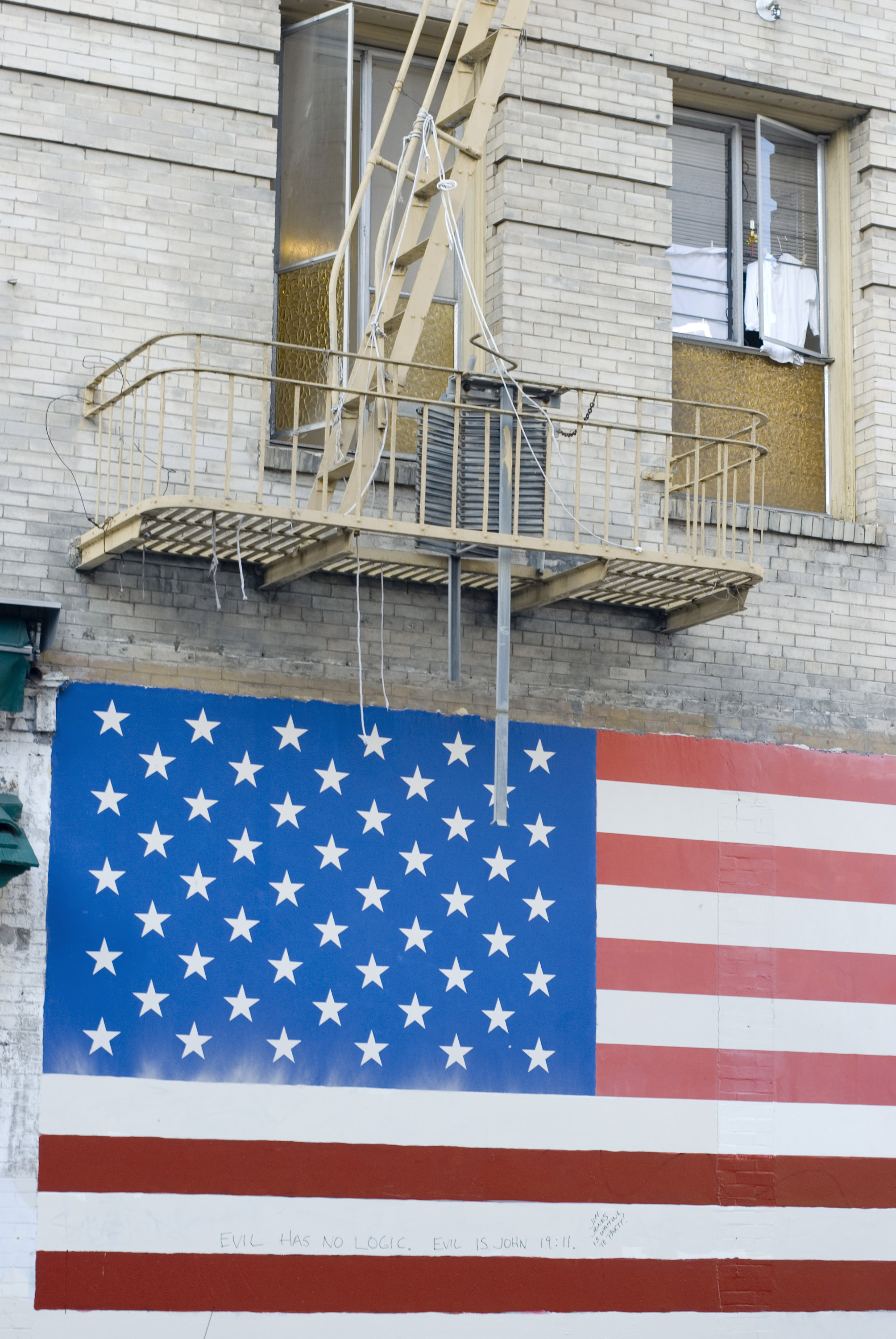 Keywords: flag, american, san francisco, building, block, apartment, fire escape, brick, national, nationalistic, partiotic, america, stars and stripes, flag, painting, mural, painted