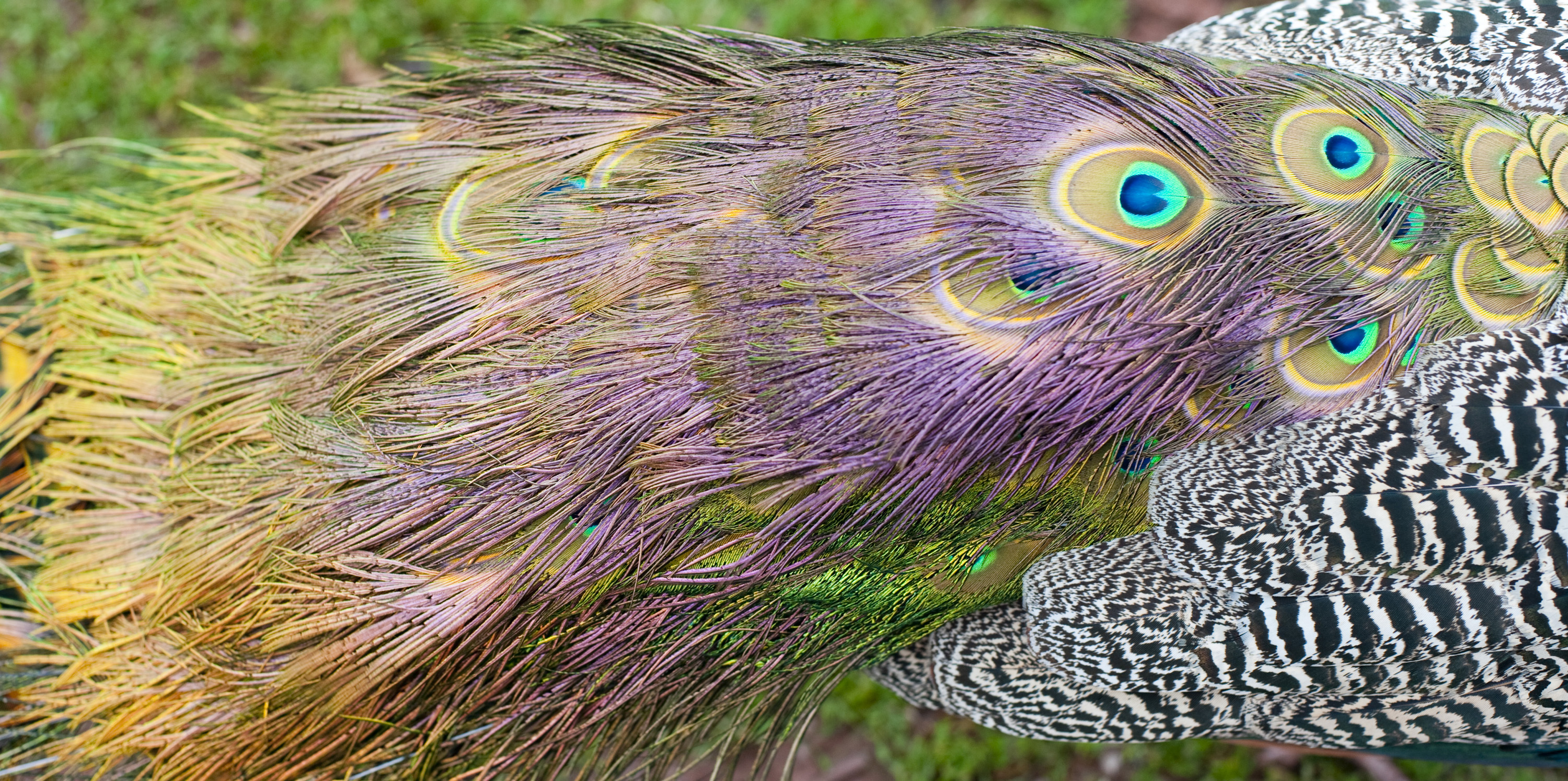 Closeup detail of the long colourful coverts, or tail, of a peacock with the distinctive eye pattern used to attract females during courtship