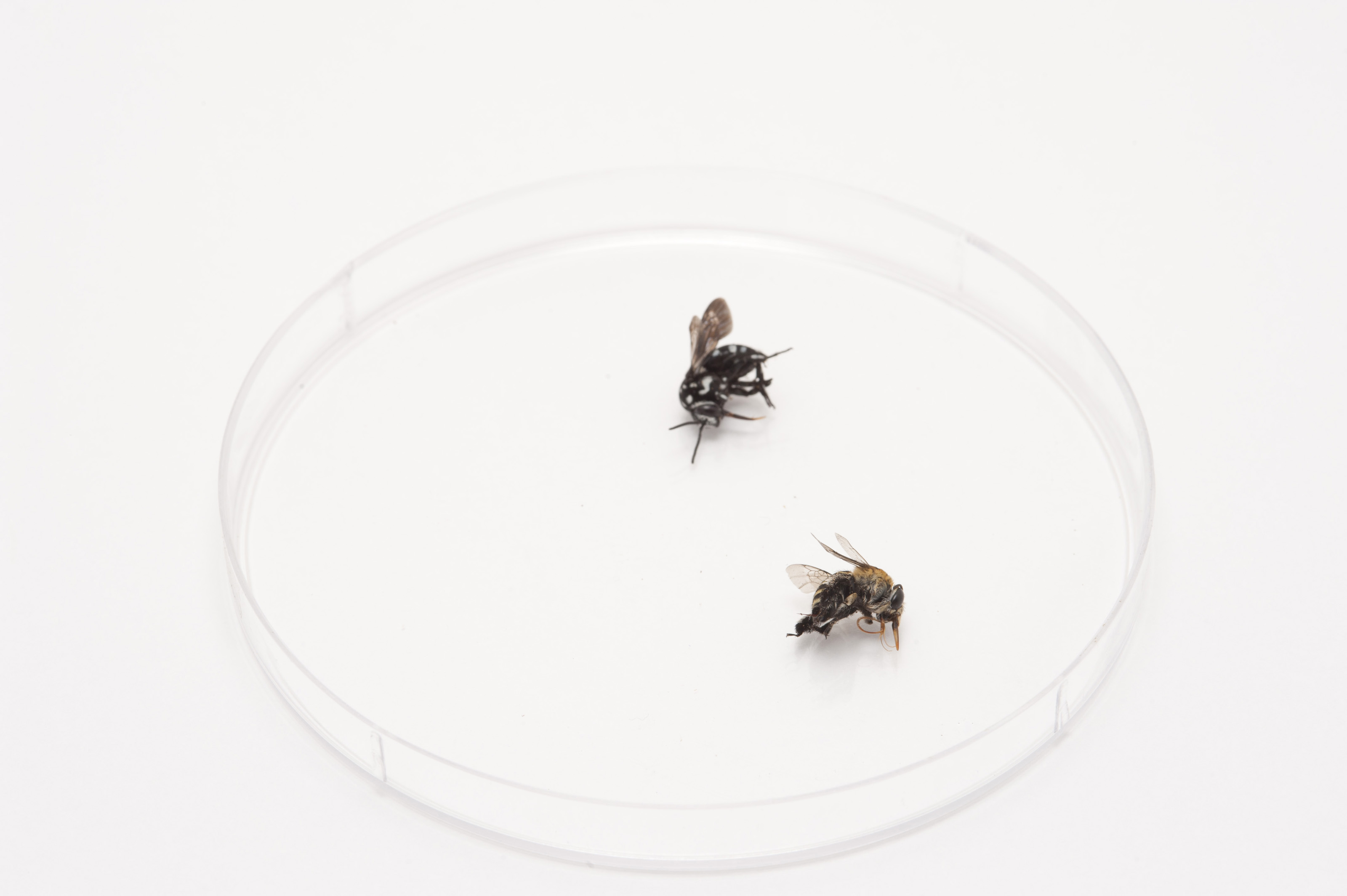 Two dead household flies lying in a plastic petri dish on a white surface