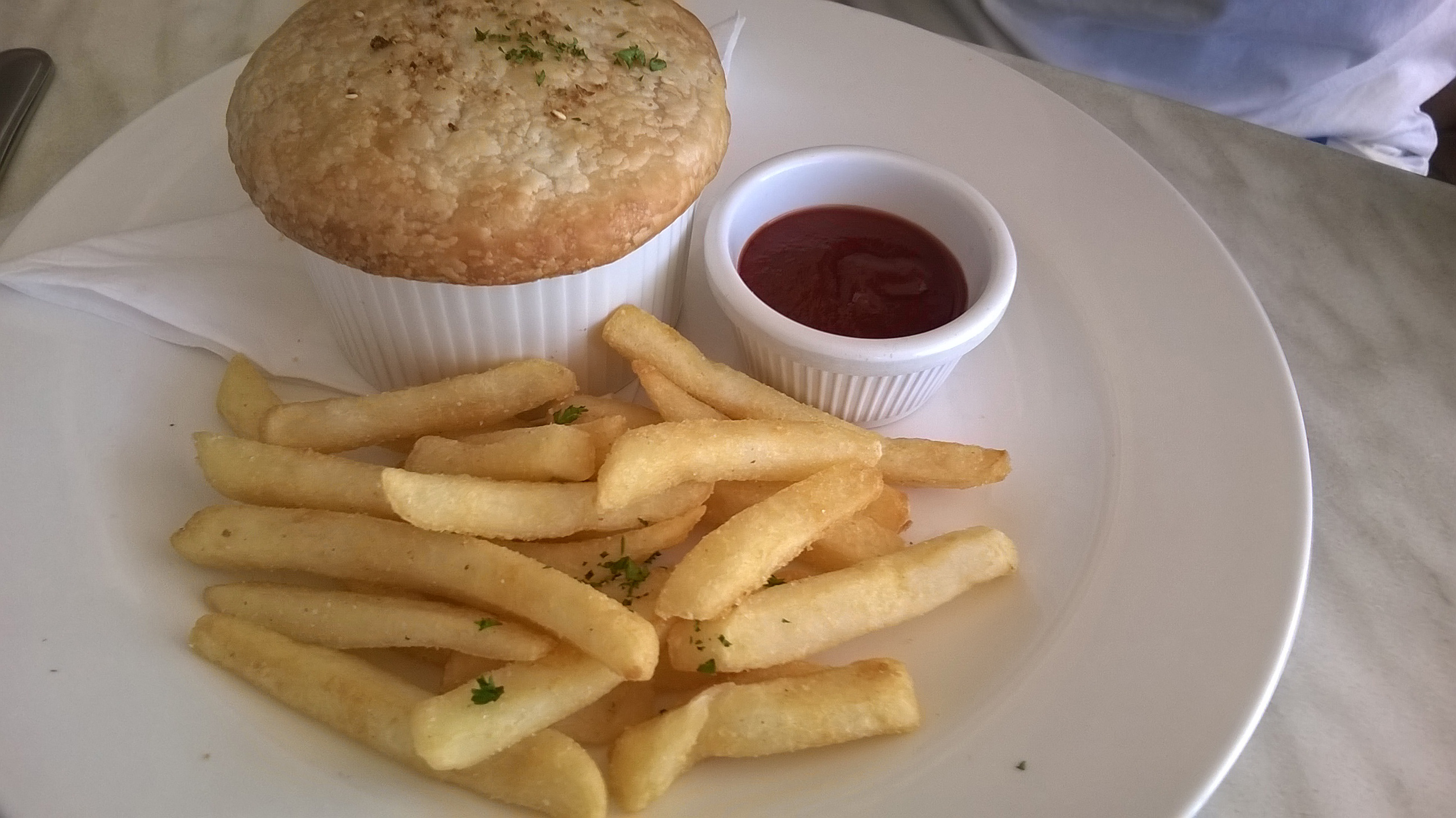12302 French fries served with a pie - this image by freefoodphotos is licensed under a Creative Commons Attribution 3.0 Unported License.