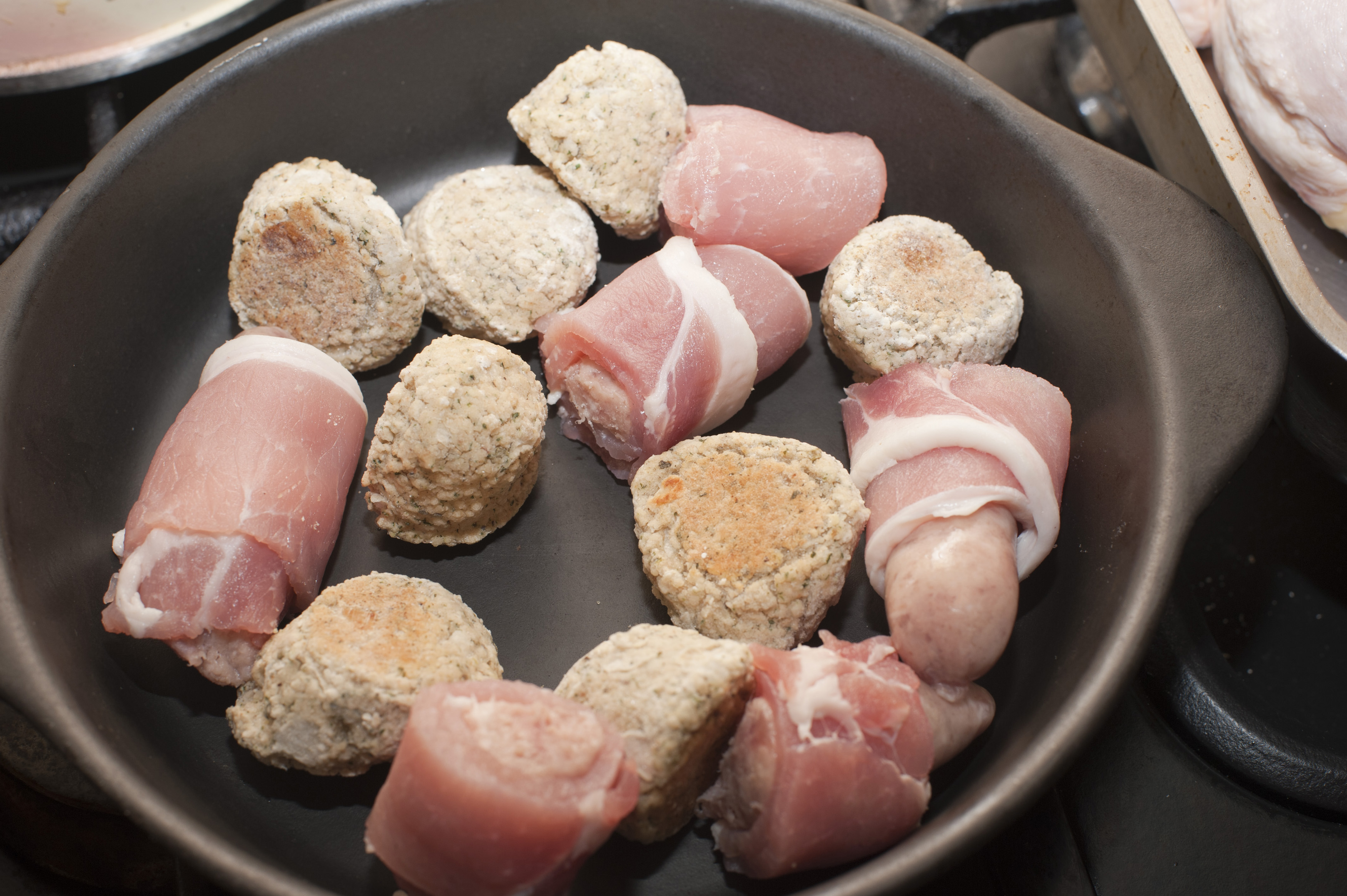 Keywords: bacon, blanket, cooking, food, pan, pigs, pork, preparation, rasher, sausage, wrapped, roll, raw, ready, breakfast