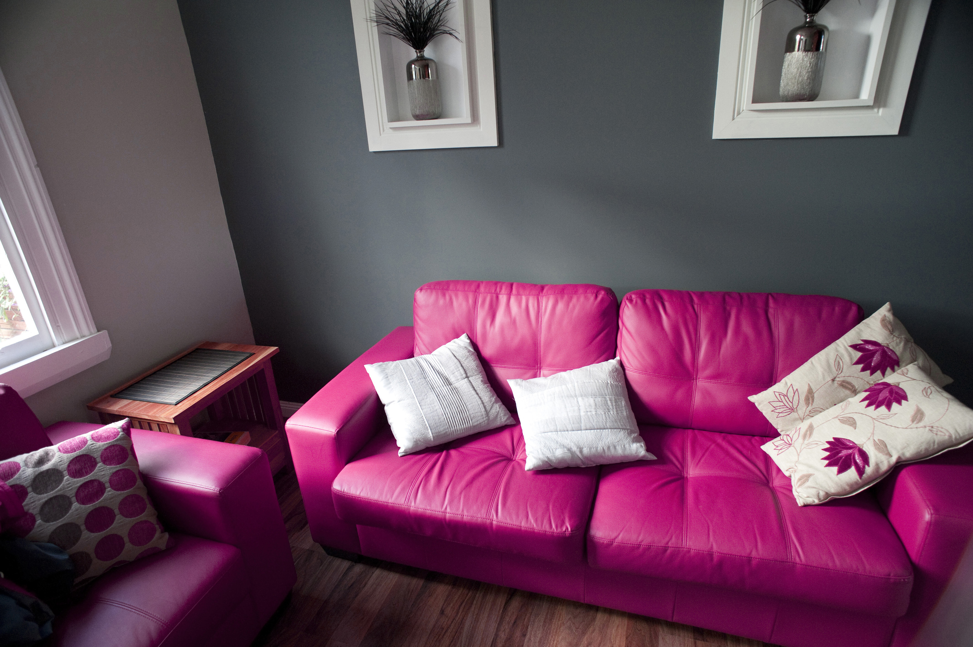 Keywords: couch, leather, living room, lounge, pink, settee, sofa, suite, bright, pink, loud, colorful, vivid, floral, grey, modern, trendy, fashionable, fushia, magenta