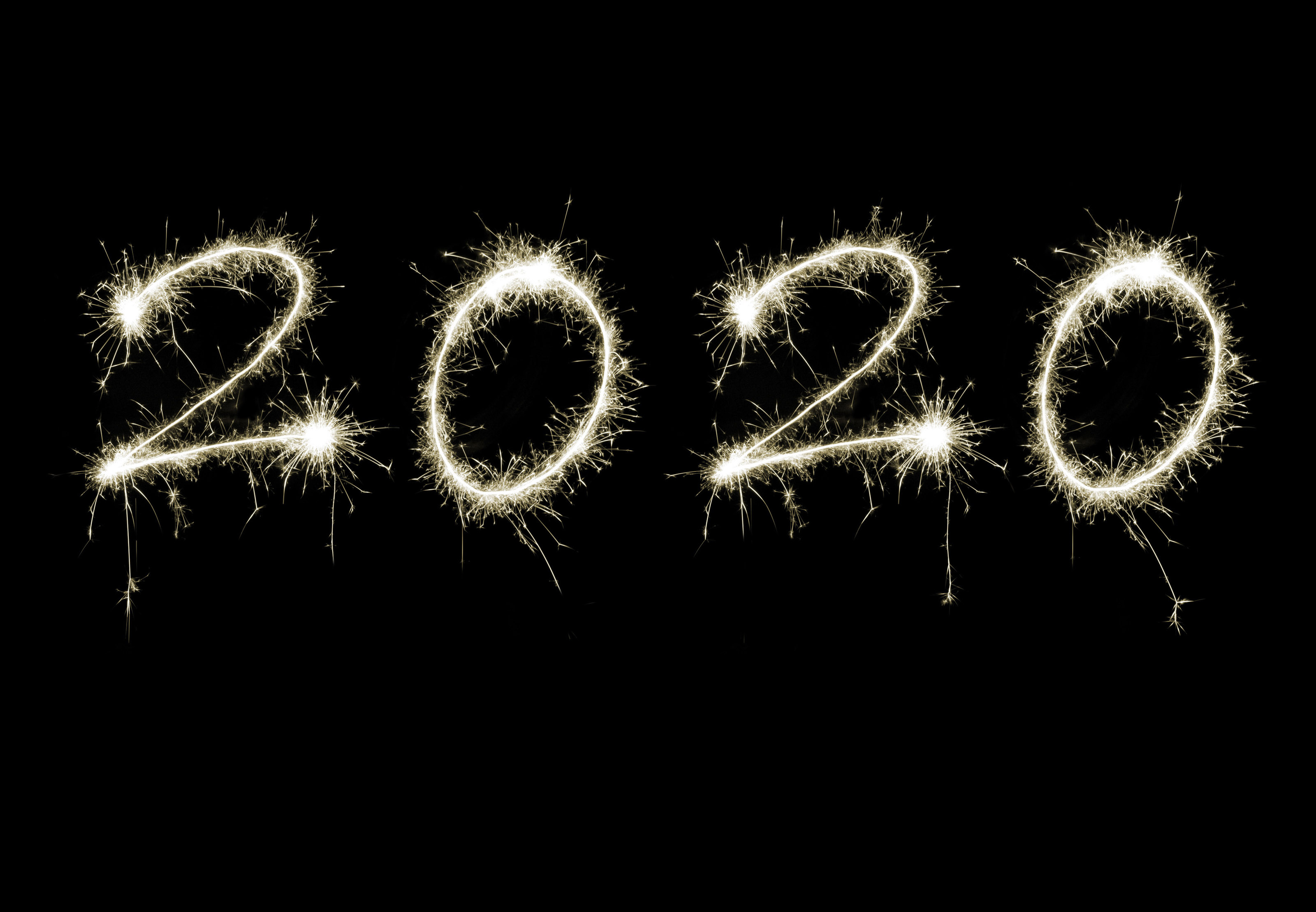 Festive 2020 greeting card background with a fiery date formed by sparklers over black with copy space for a holiday message
