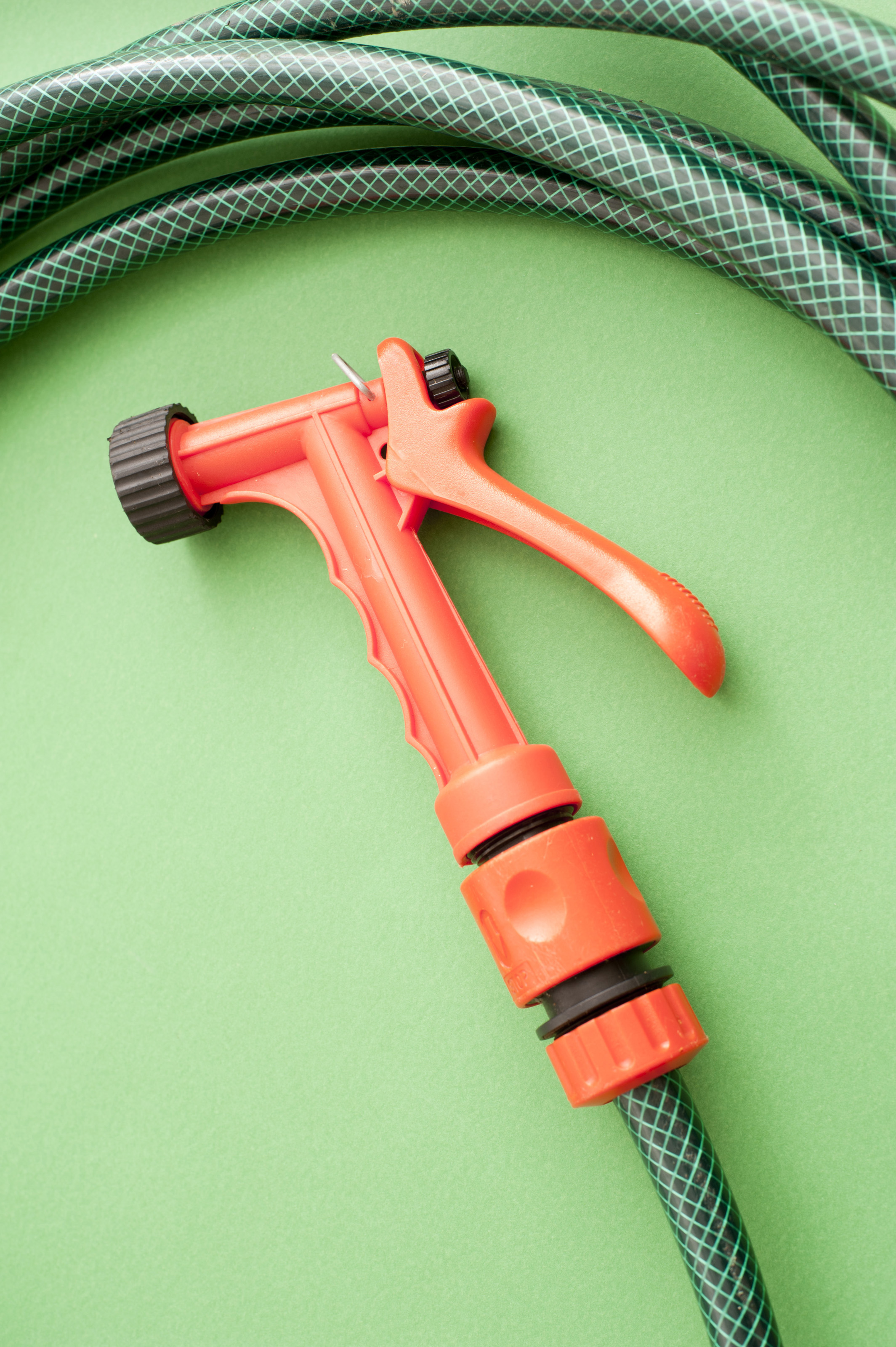 a hand held garden hose pipe water spray trigger on a green coloured background