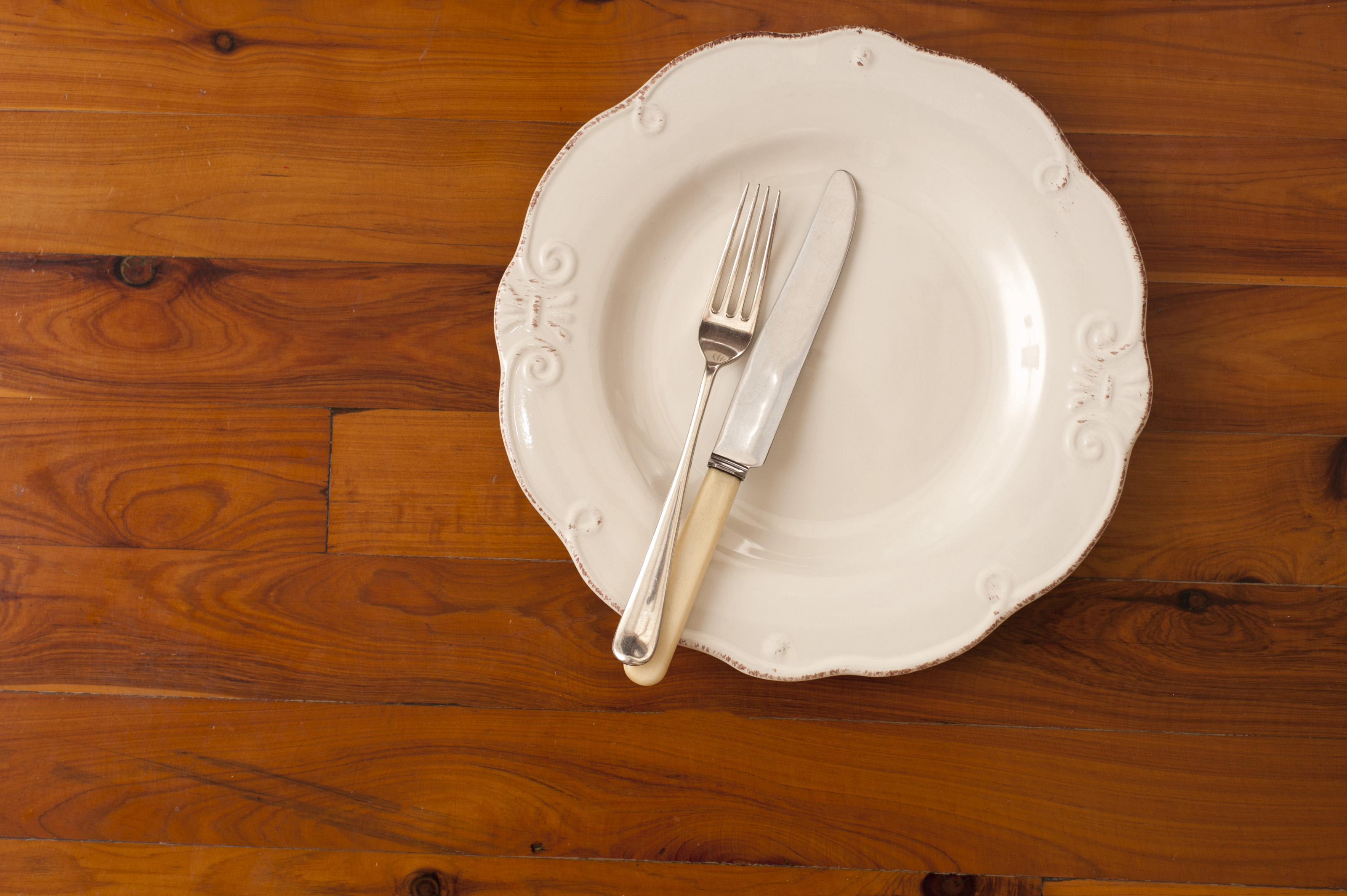 Keywords: fork, knife, plate, crockery, cutlery, dinnerware, eating, empty, overhead, serve, table, utensils, copyspace, wood, food