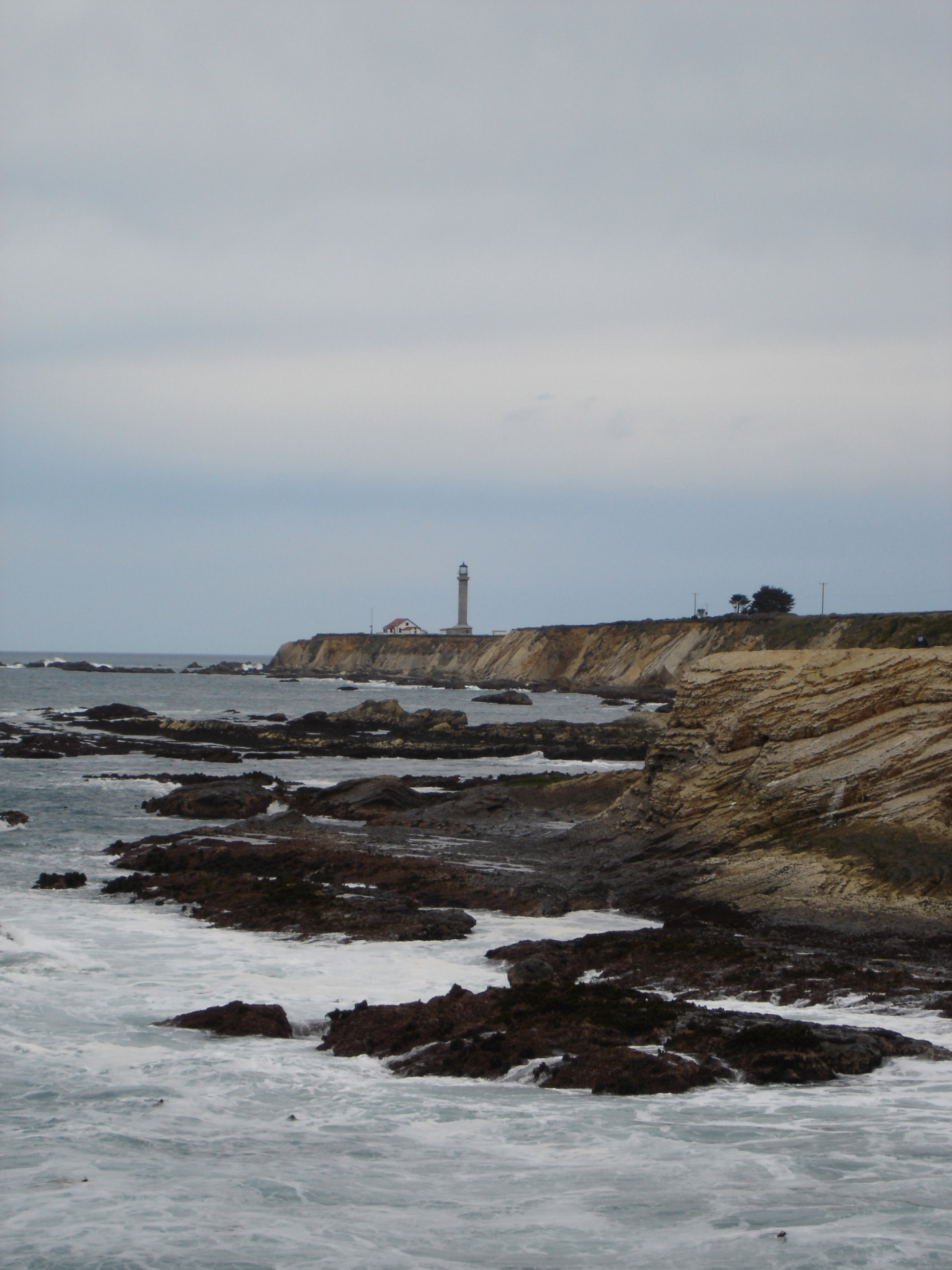 Keywords: travel, landscape, outdoors, rocky, distant, waves, beach, shoreline, coastline, point, usa, lighthouse, united states, overcast, california