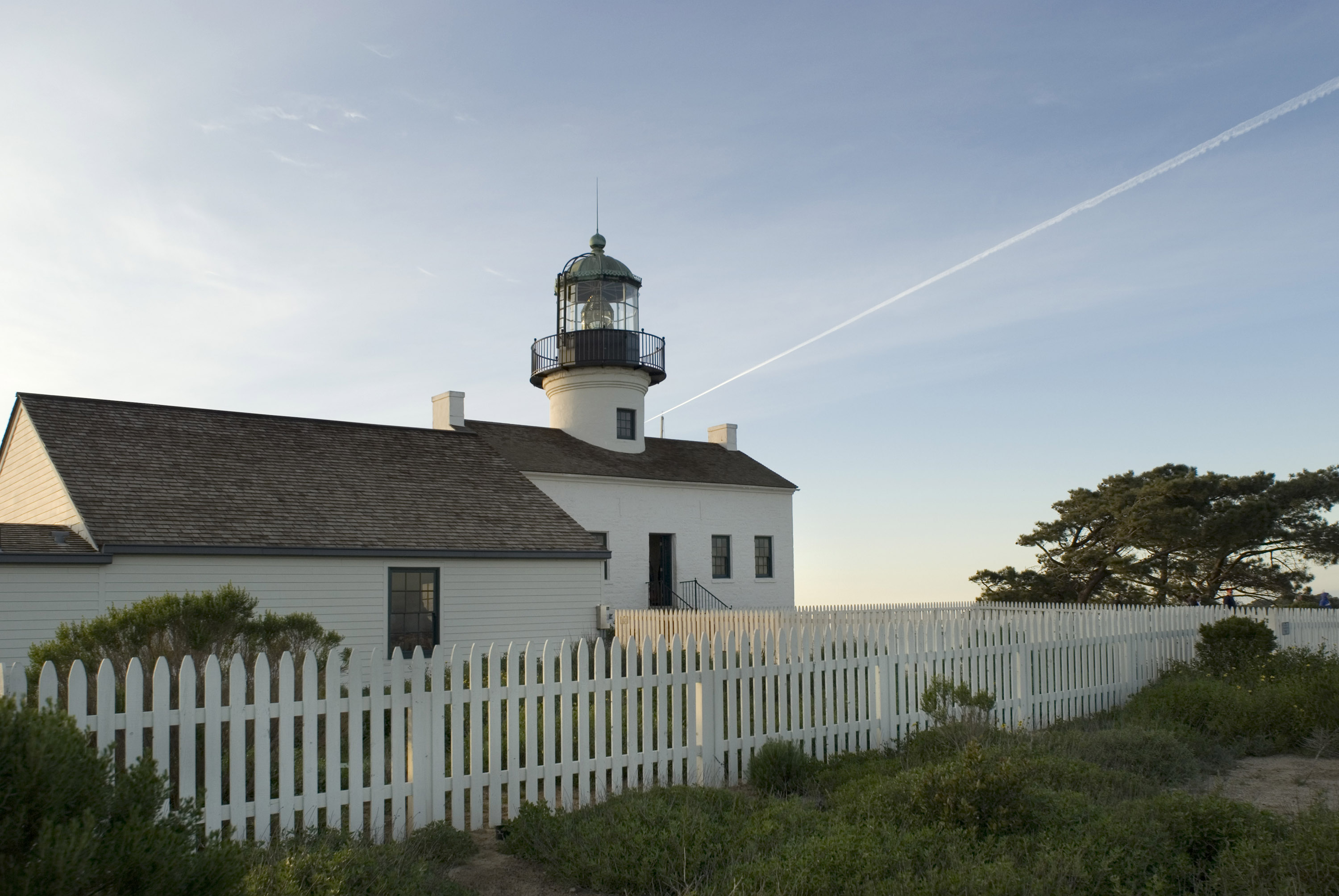 Keywords: san diego, landmark, historic, point loma, light house, cabrillo national monument, building, dusk, picket fence, white, painted, historic, national park, picket fence
