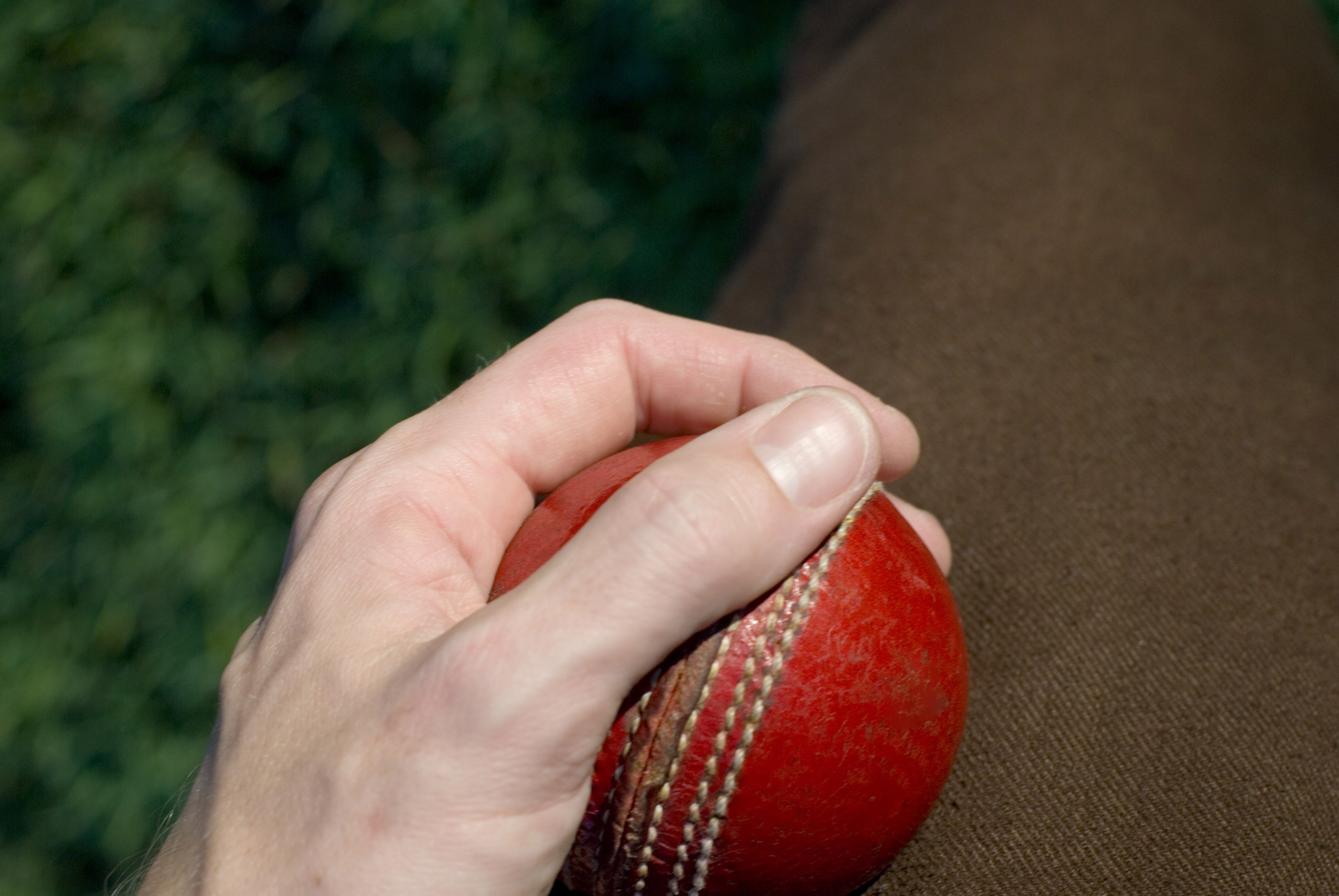 Keywords: sport, sports, cricket, ball, red, leather, traditional, green, grass, pitch, field, game, games, sporting, shiny, polish, smooth, pants, trousers, shorts