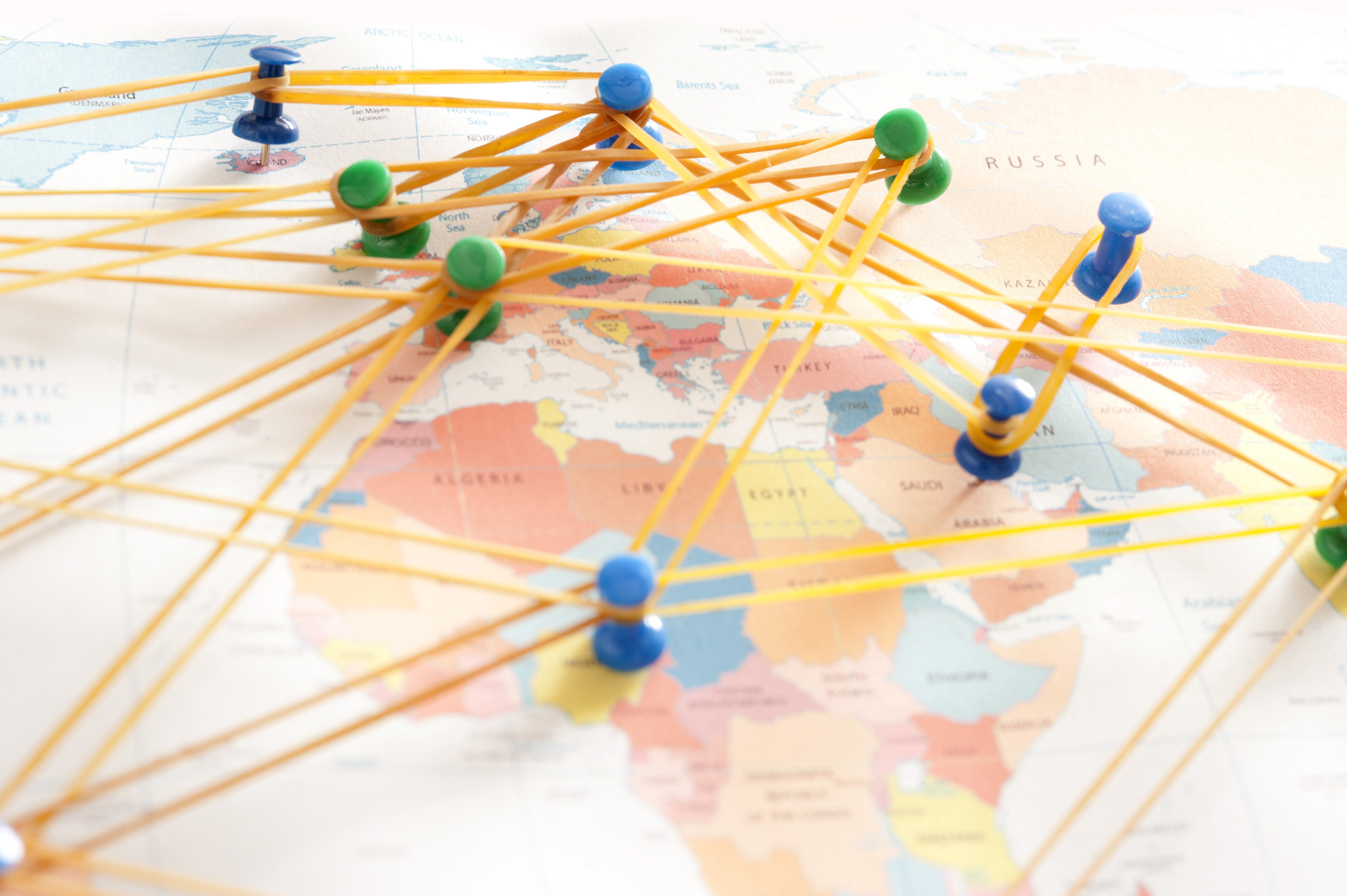 Conceptual Image of Push Pins Inserted in Various Locations on World Map Connected with Rubber Bands