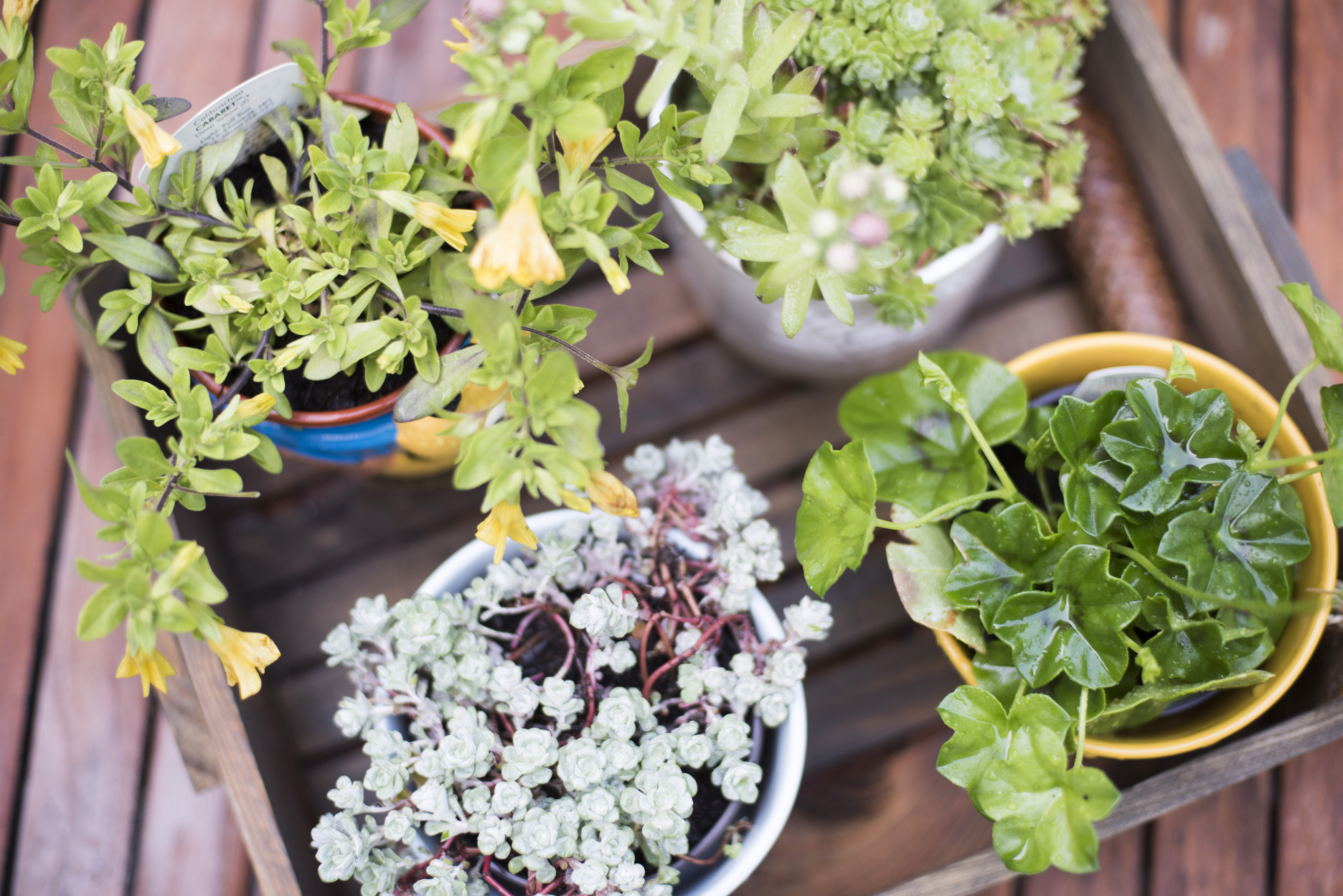 Keywords: flowerpots, garden, houseplants, plants, potted, gardening, flowers, green, leafy, crate, yellow, deck, patio, cultivation, outdoors