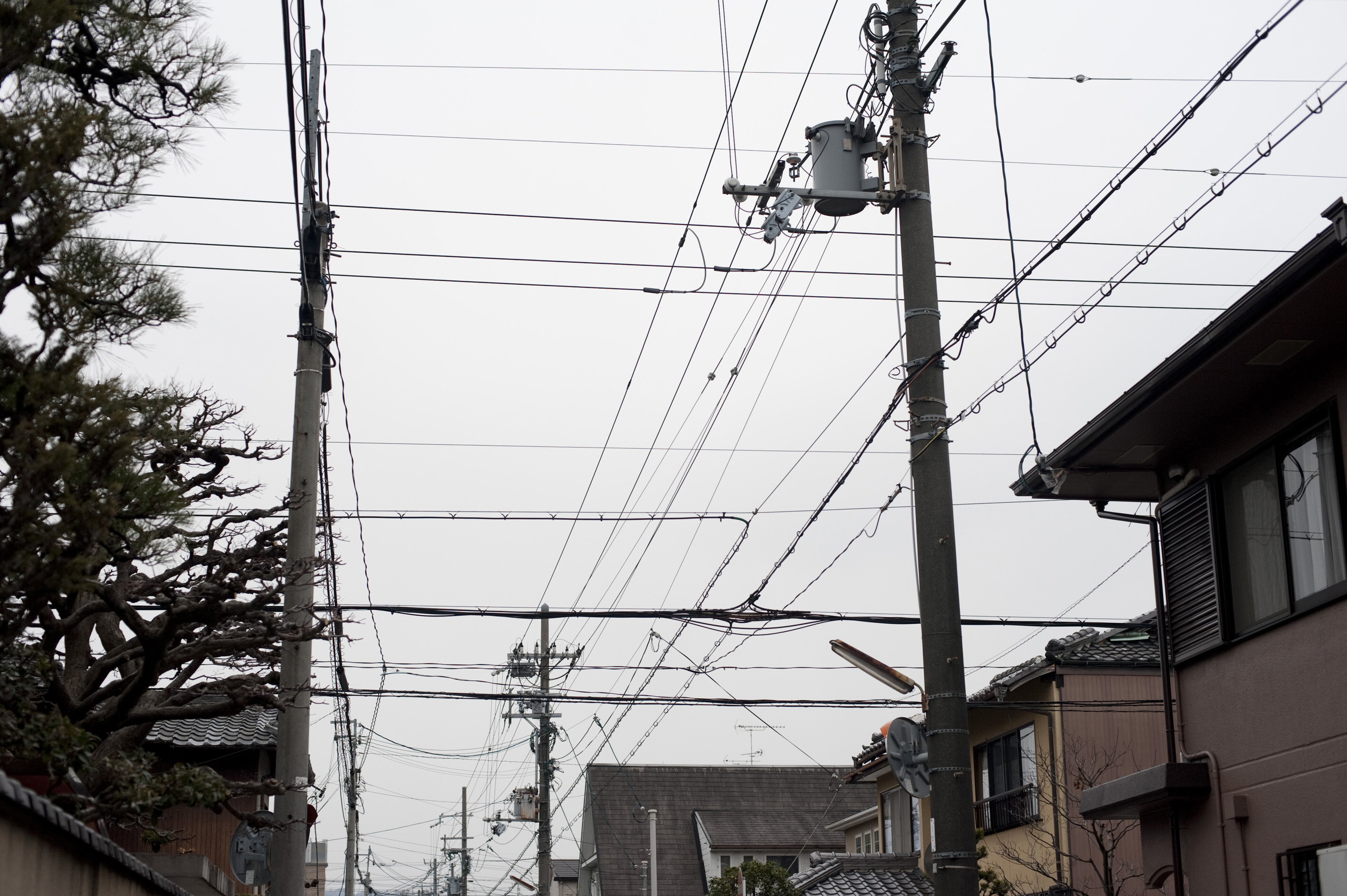 a common sight in japan, power and communications cables strung down the street from poles