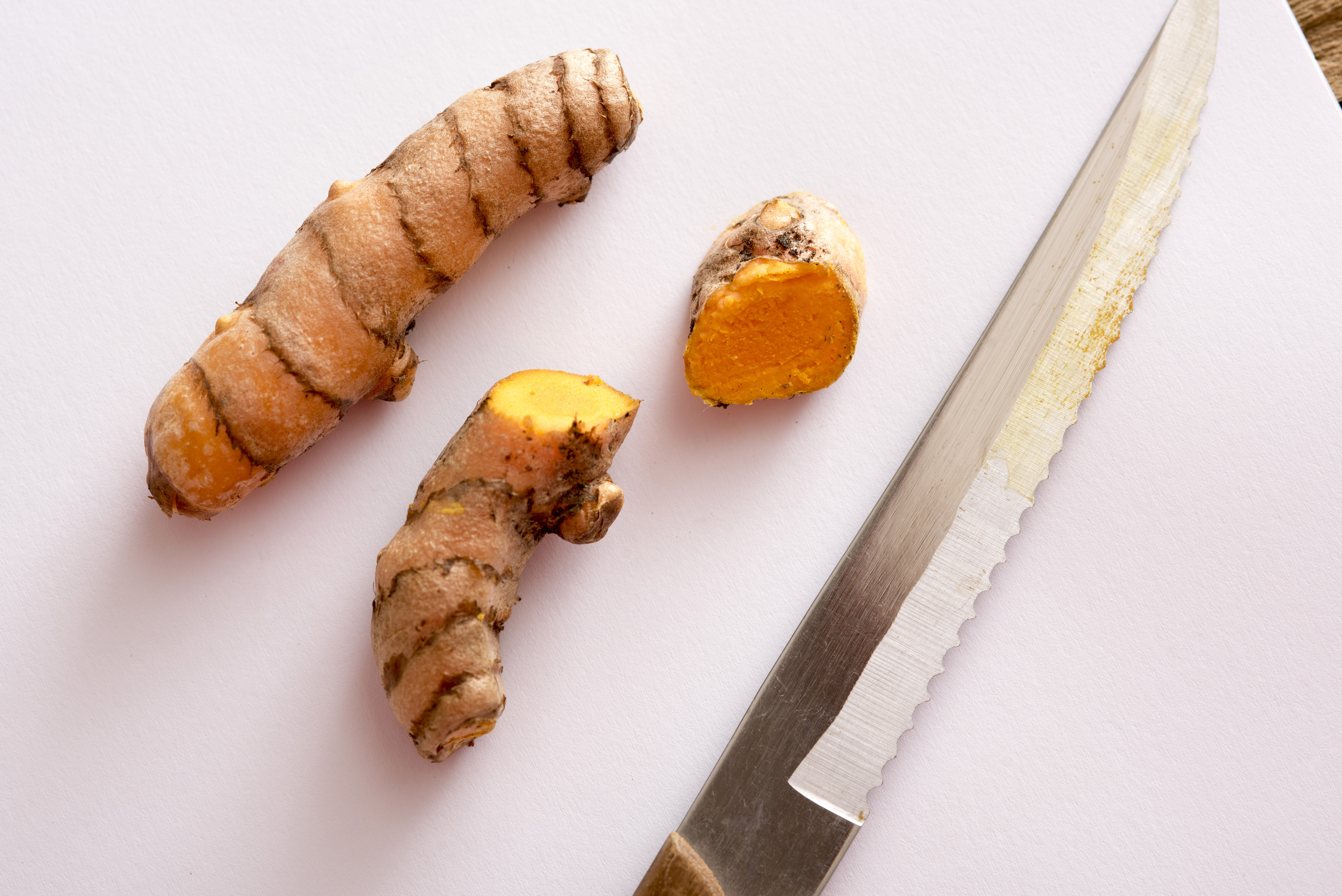 A close up of sliced turmeric and a serrated knife on a white chopping board.