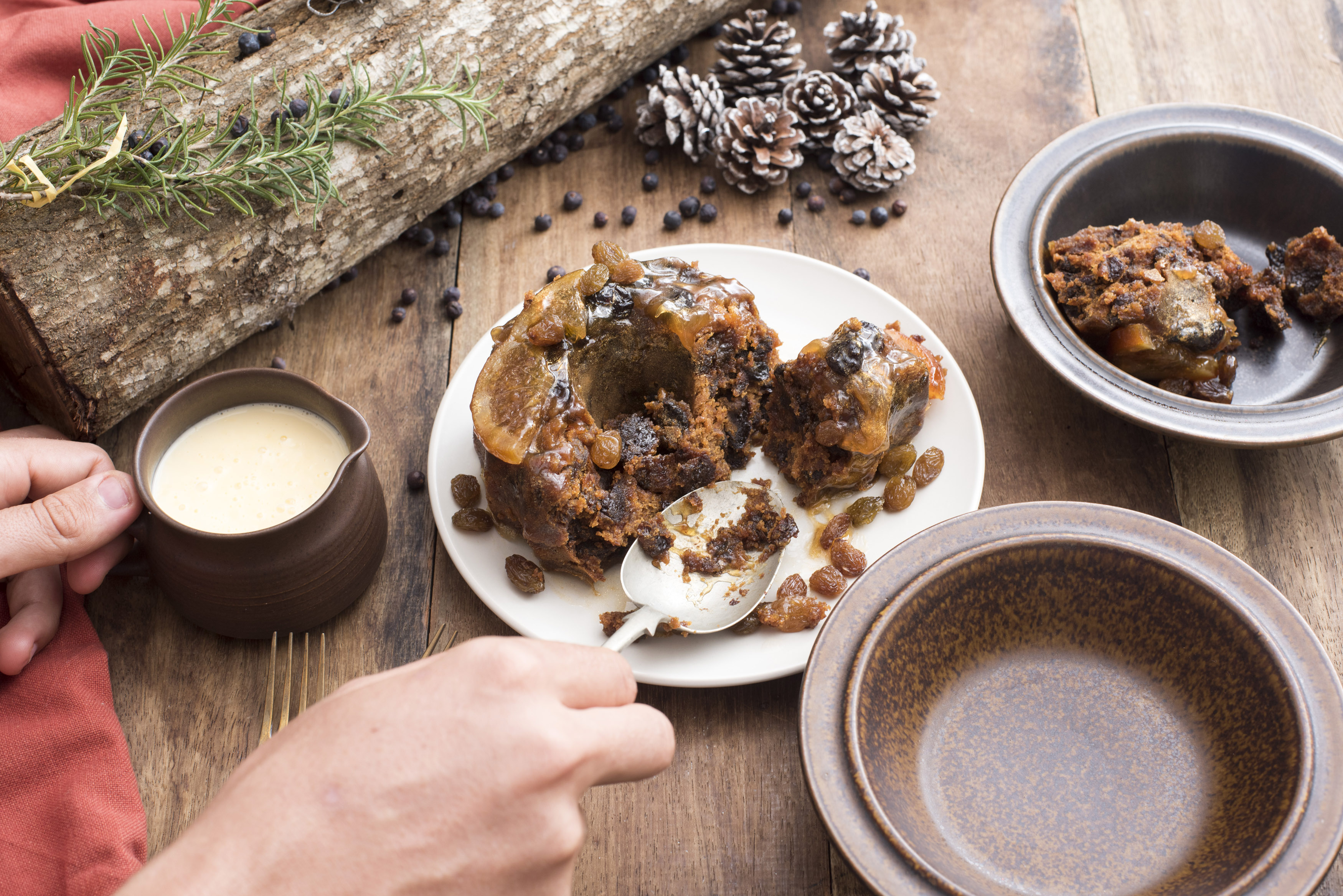 Man serving Christmas pudding and brandy sauce spooning it into two bowls on a rustic decorated table
