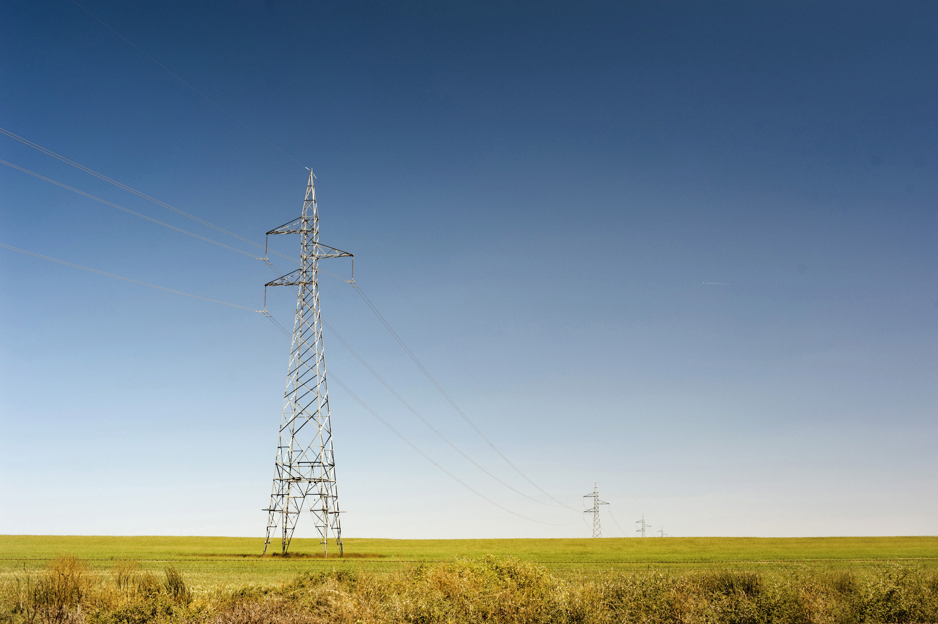 high voltage power cables sending electric across the countryside