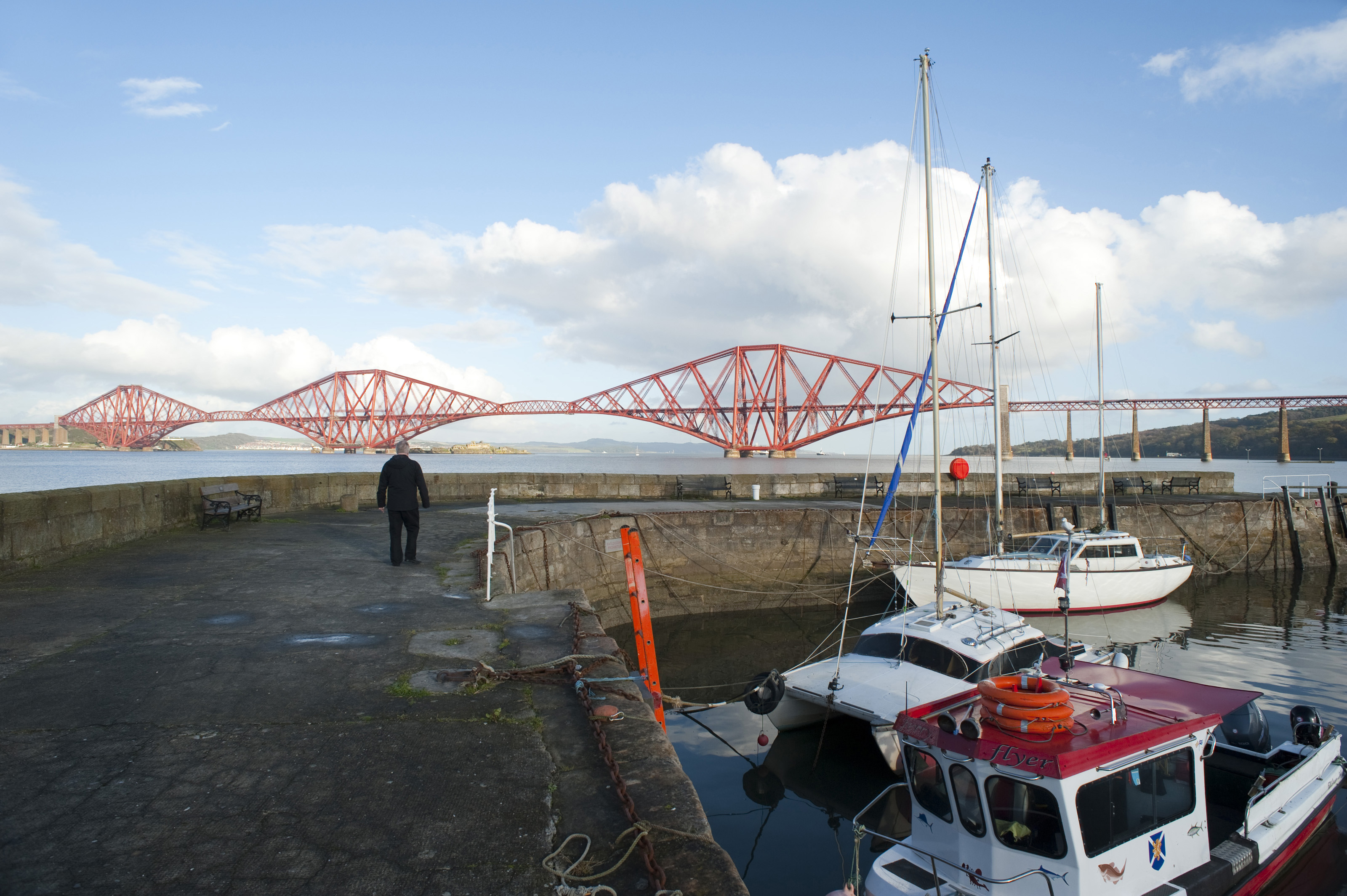 Keywords: man, travel, structure, railway, historical, landmark, bridge, crossing, rail, sightseeing, harbour, boats, infrastructure, scotland, moored, cantilever, forth bridge, forth rail bridge, queensferry, firth of forth