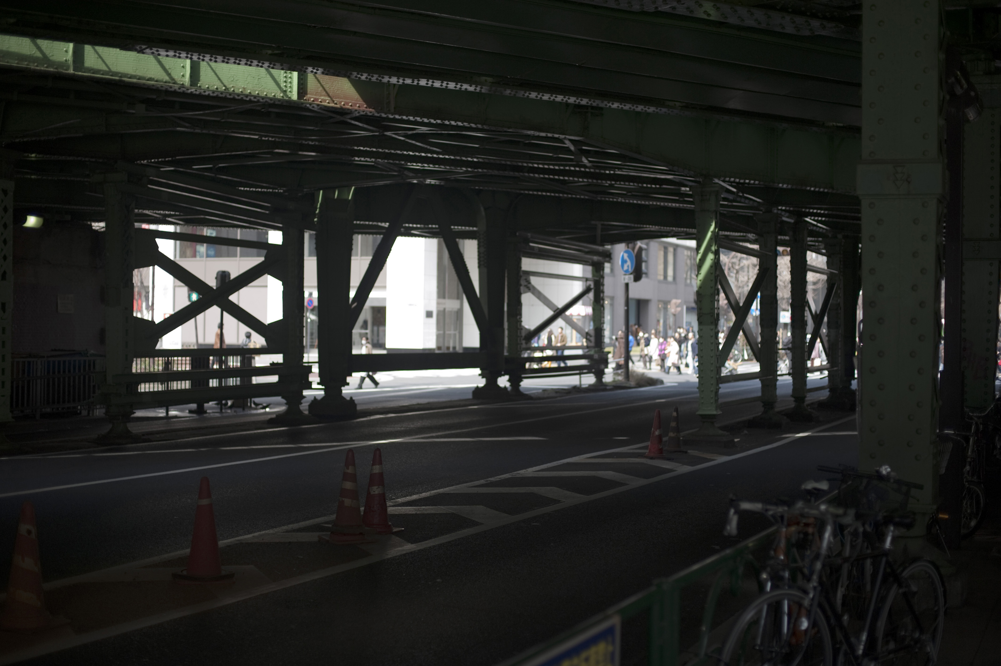 underneath a metal railway bridge, ginza, tokyo