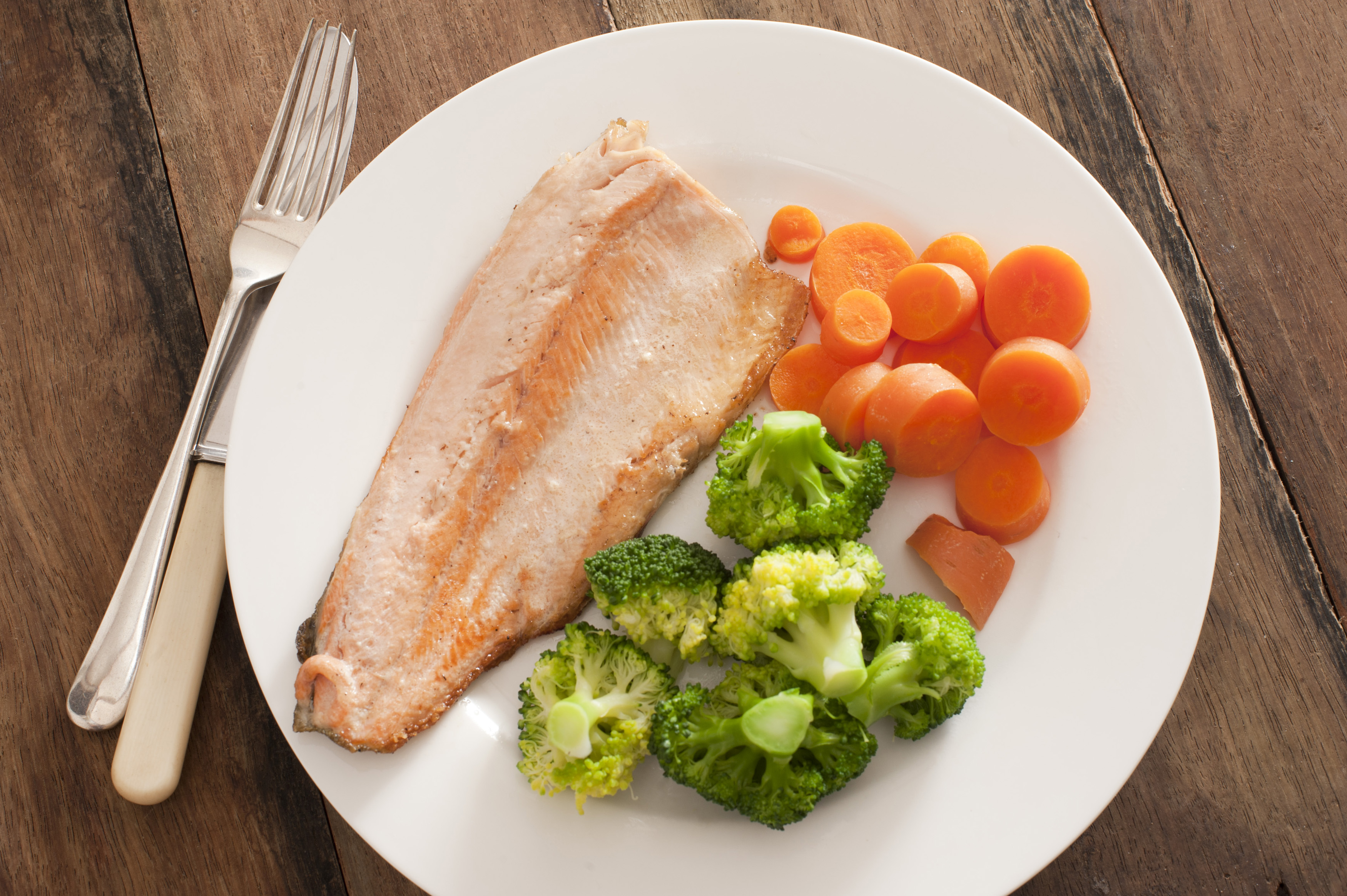 Keywords: above, broccoli, carrots, dish, fish, food, healthy, meal, plate, table, trout, vegetables, utensils, simplicity, cuisine