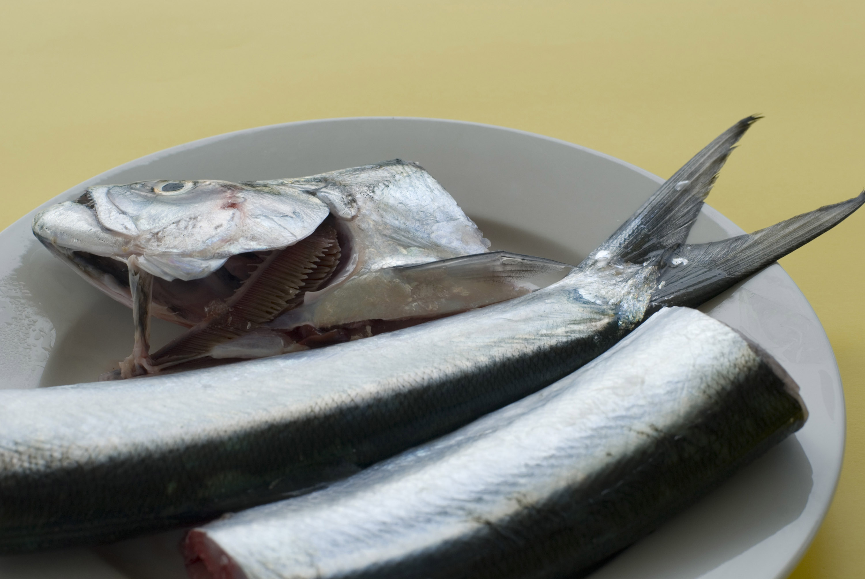 Preparing fresh fish with the head and tail on a plate in the process of being cleaned for the kitchen