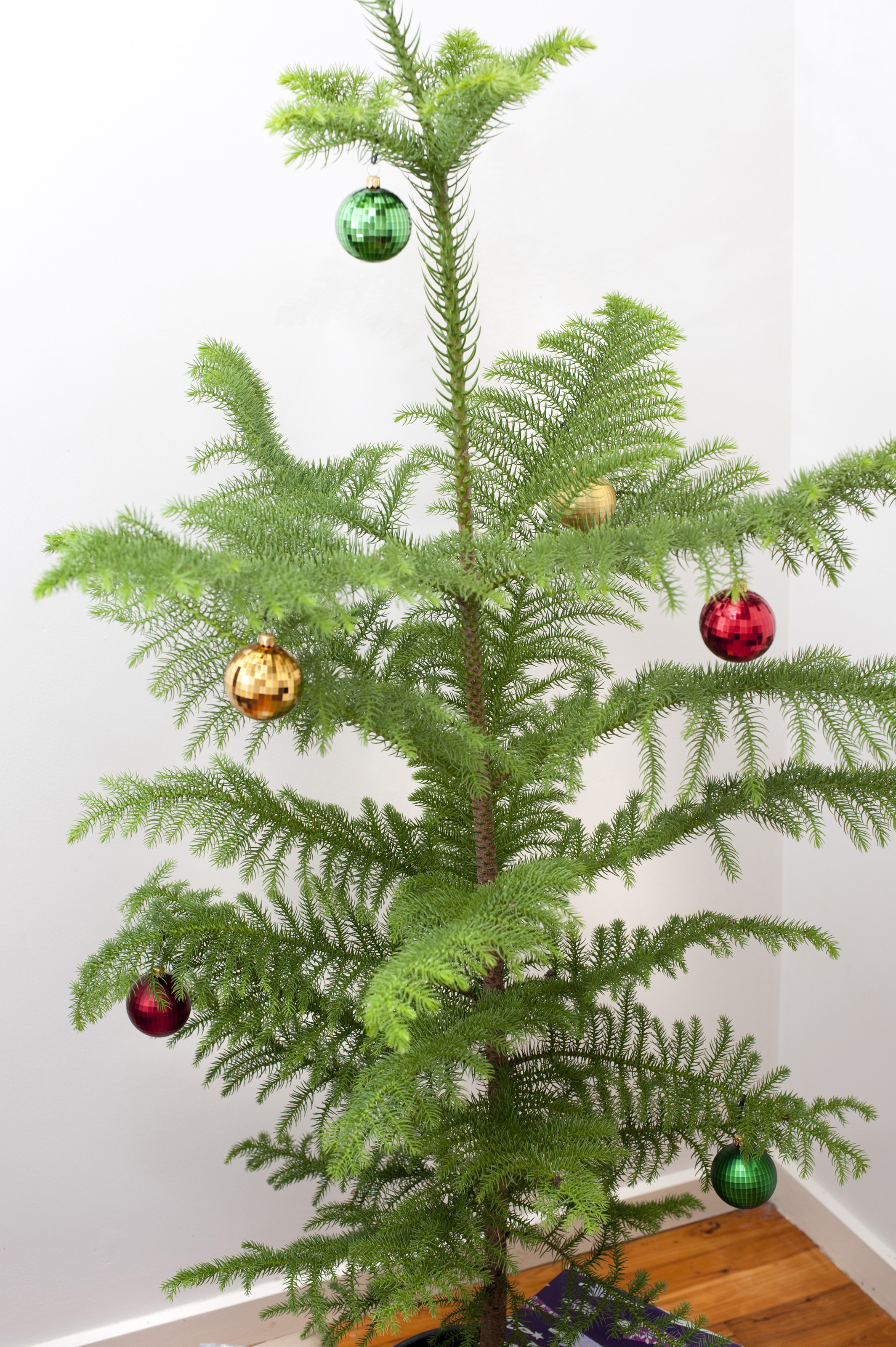 Real evergreen Norfolk Island pine Christmas tree decorated with colourful baubles to celebrate the holiday season standing in the corner of a room