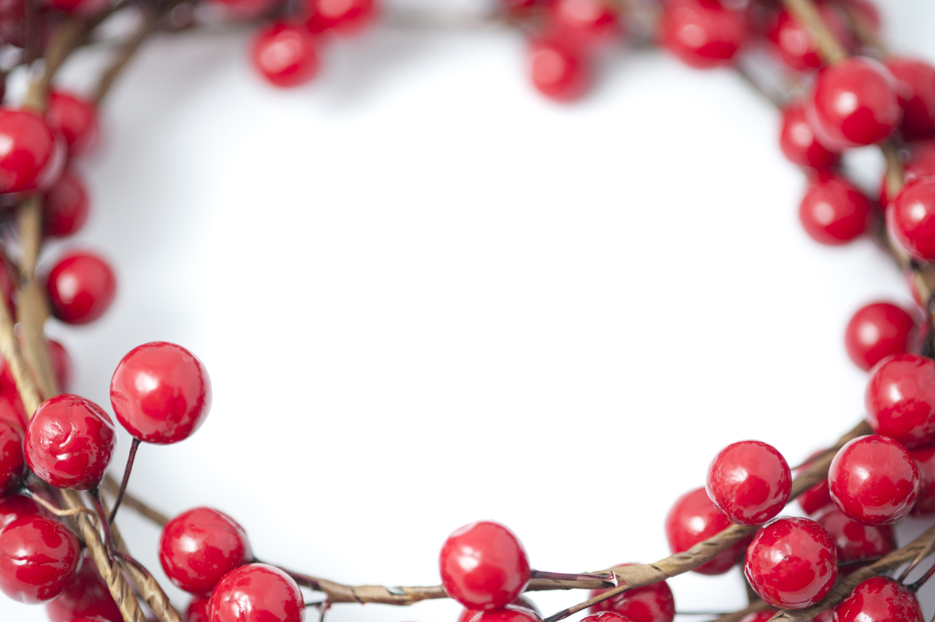 Border, wreath or frame of artificial festive red Christmas berries around central white copy space for your holiday message