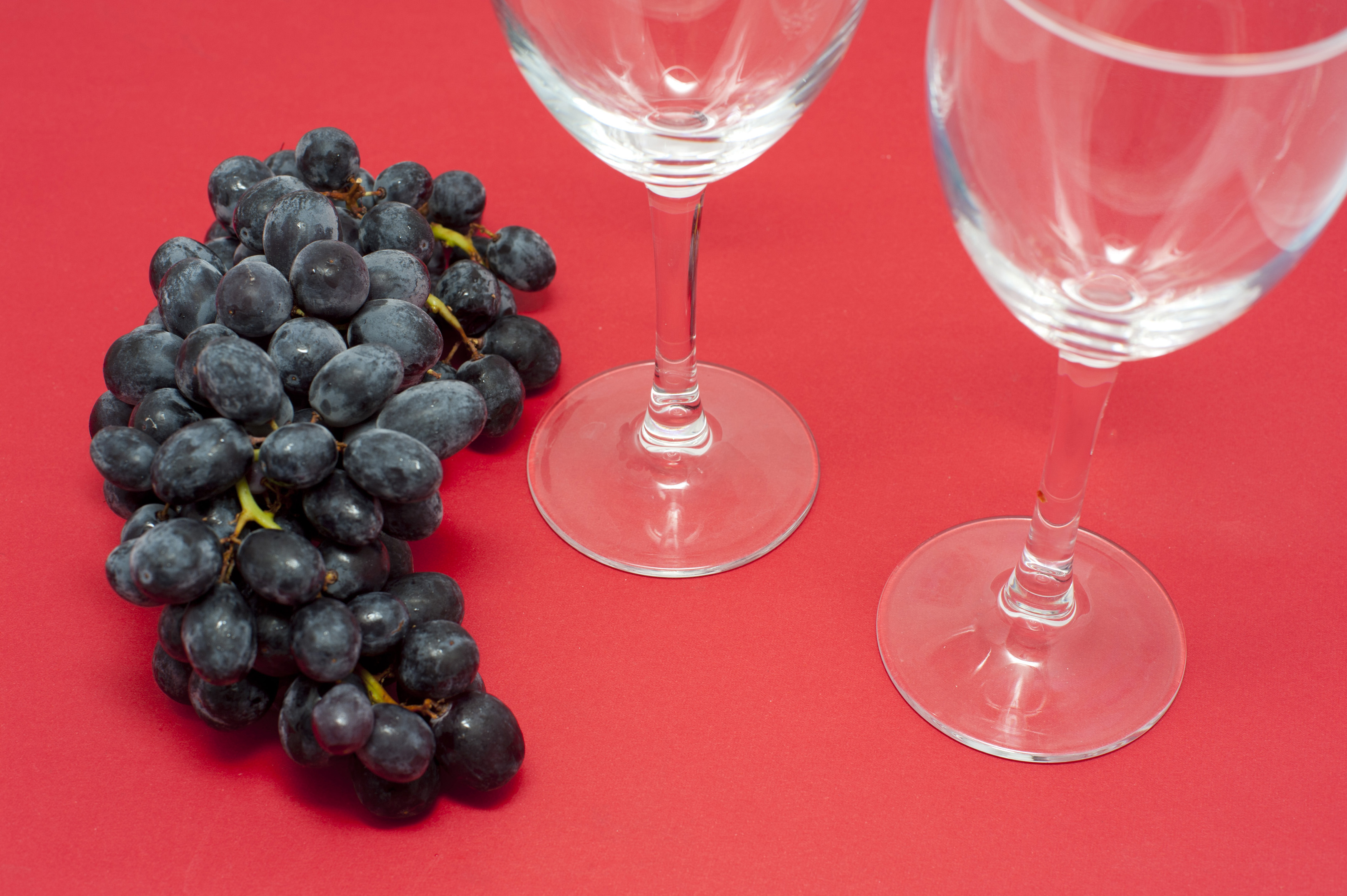 11659 Grapes on Red Background with Empty Wine Glasses - this image by freefoodphotos is licensed under a Creative Commons Attribution 3.0 Unported License.