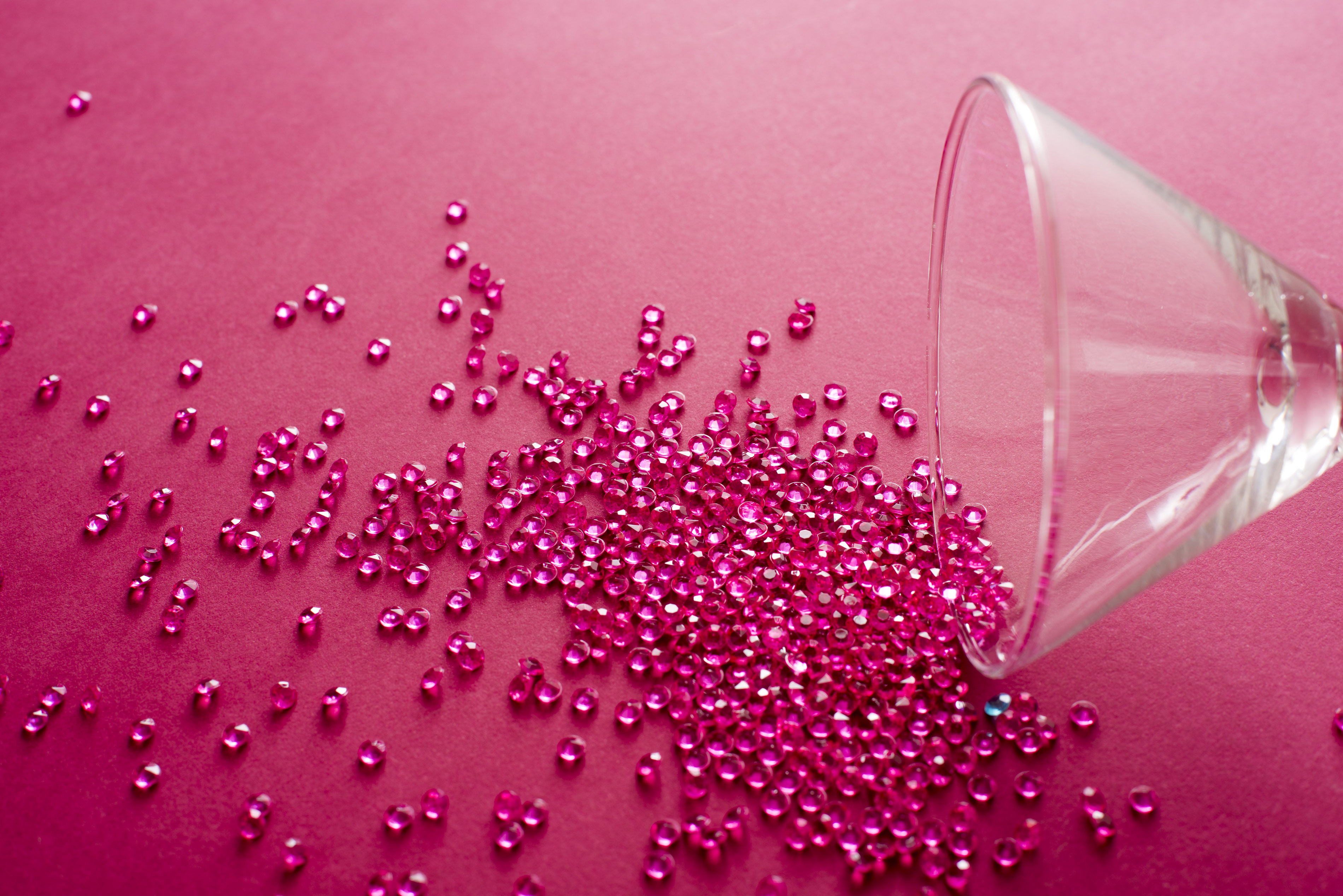 Red party background with spilled martini cocktail concept with a glass lying on its side spilling red beads onto a matching red background