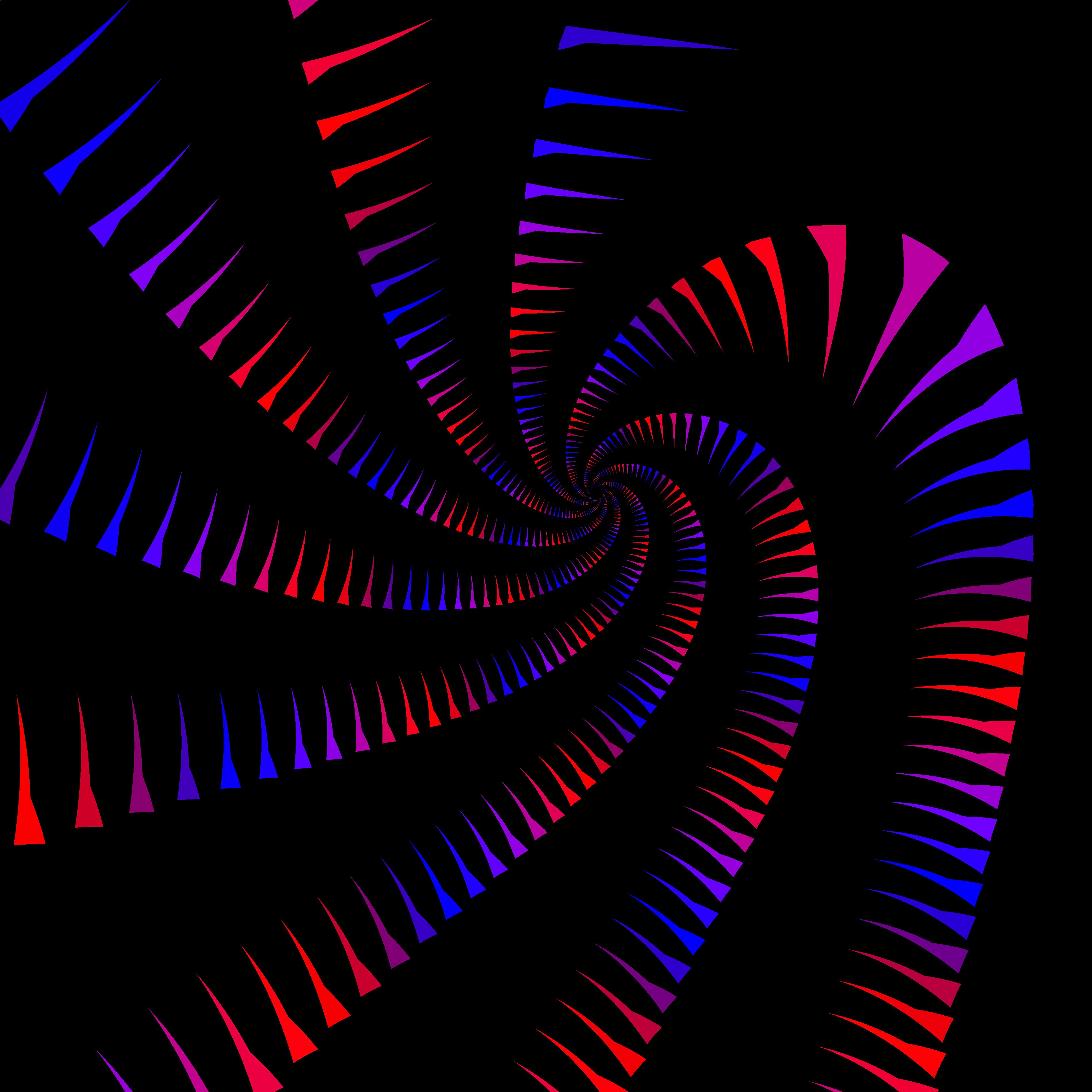 Keywords: fractal, computer generated, shape, pattern, CG, graphics, abstract, surreal, wierd, strange, unusual, red, blue, triangular, spiral, spiraling, decreasing, size, reduction, reducing, purple, pink