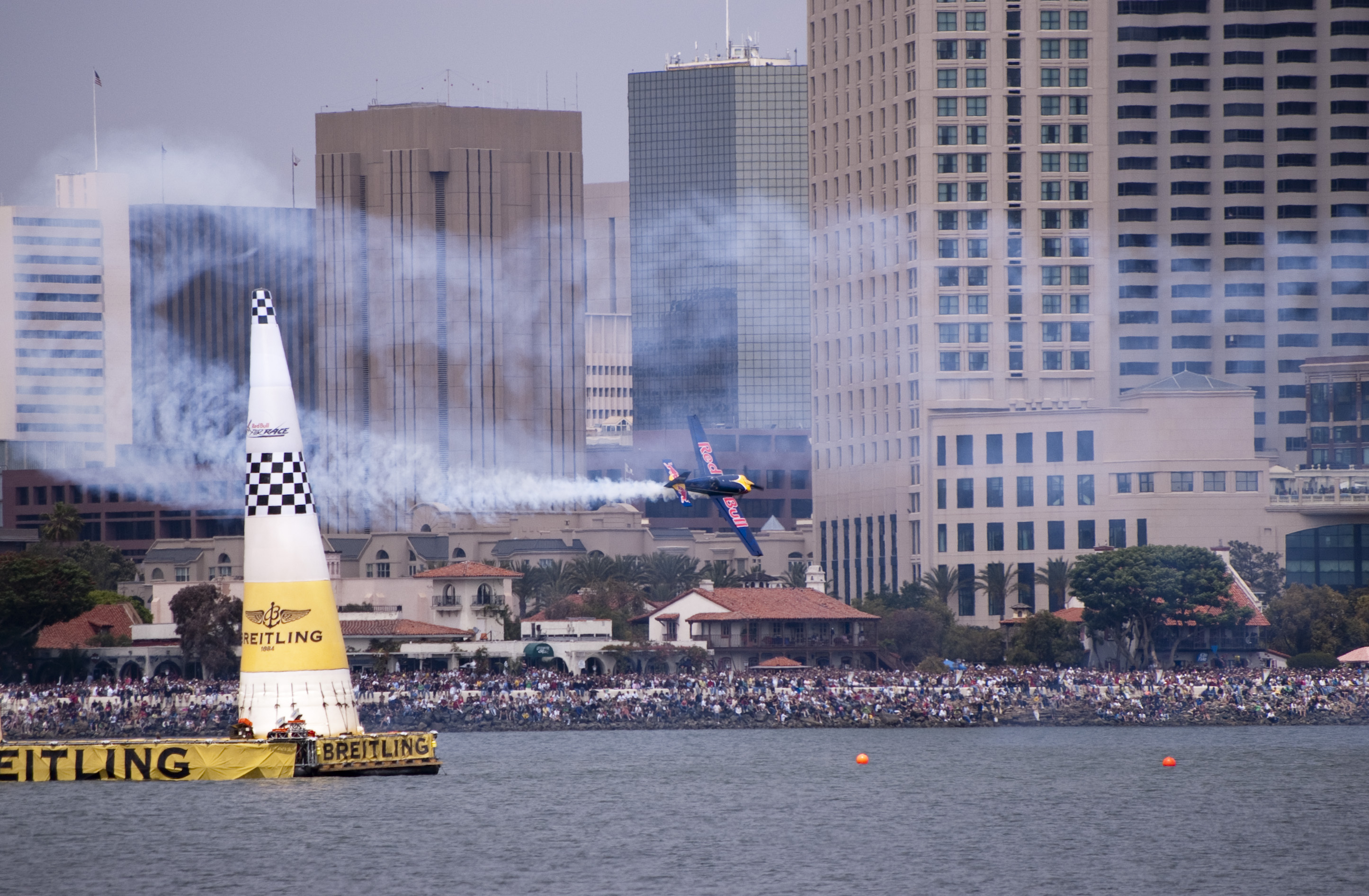 editorial use only : a plance flying through the finish gate at a red bull air race