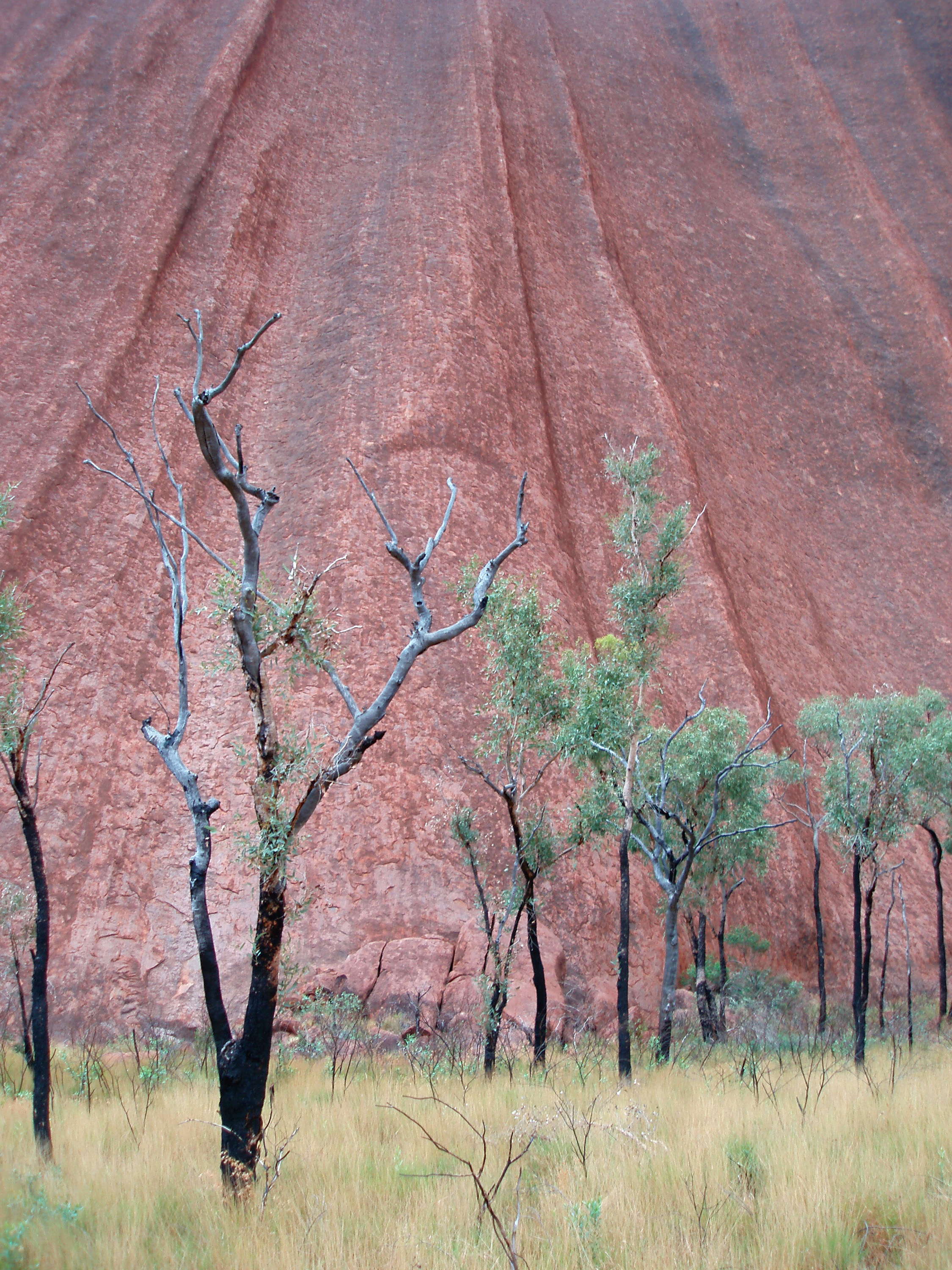 a view from a walk around the base of uluru, burnt trees contrasting against the texture of the rock