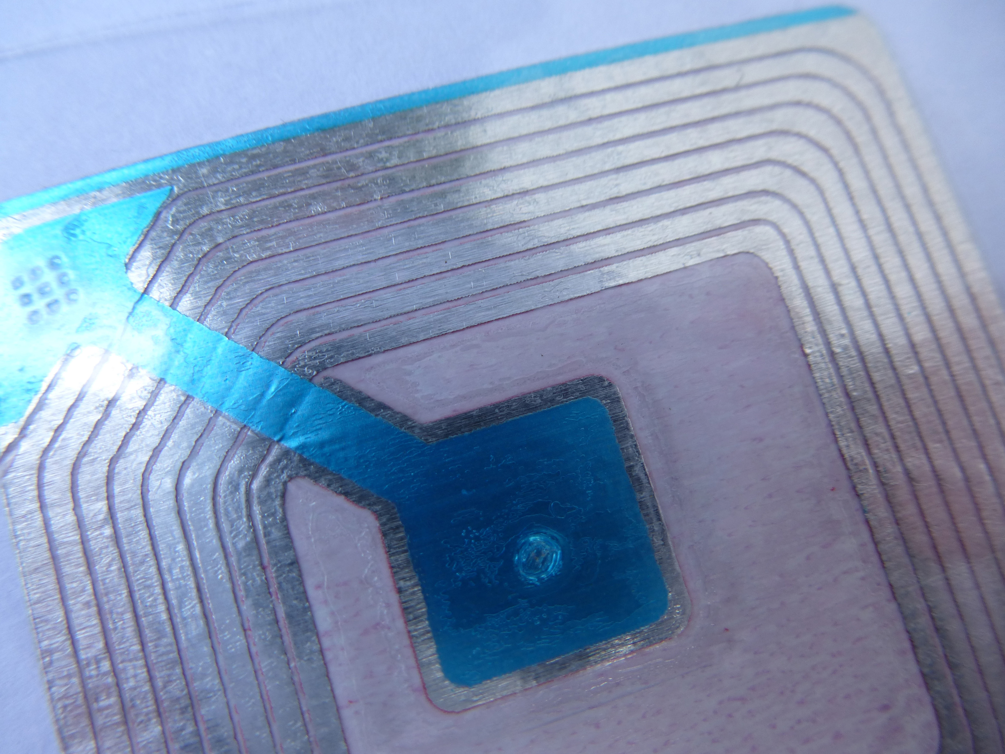 Photo Title: Detail of Blue and Silver Radio Frequency ID Tag