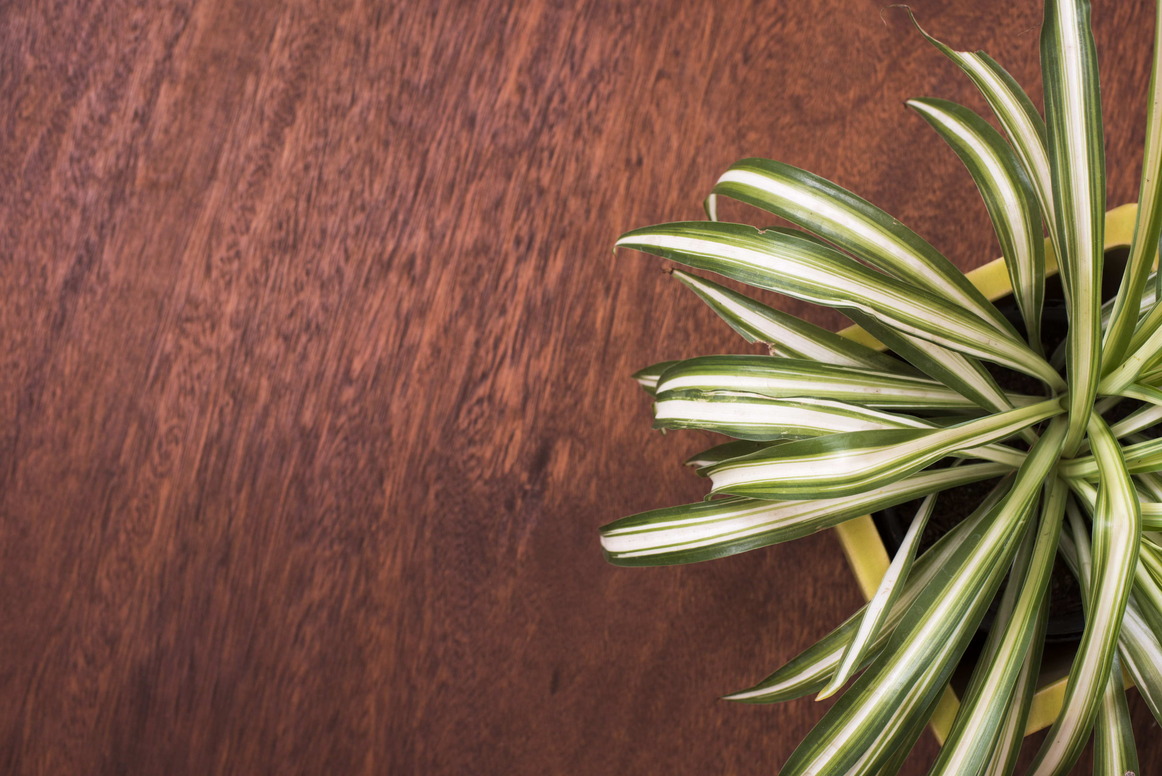 Keywords: copy space, plant, houseplant, leaves, ornamental, decorative, potted, ribbon plant, variegated, gardening, foliage, green, white, wood, overhead