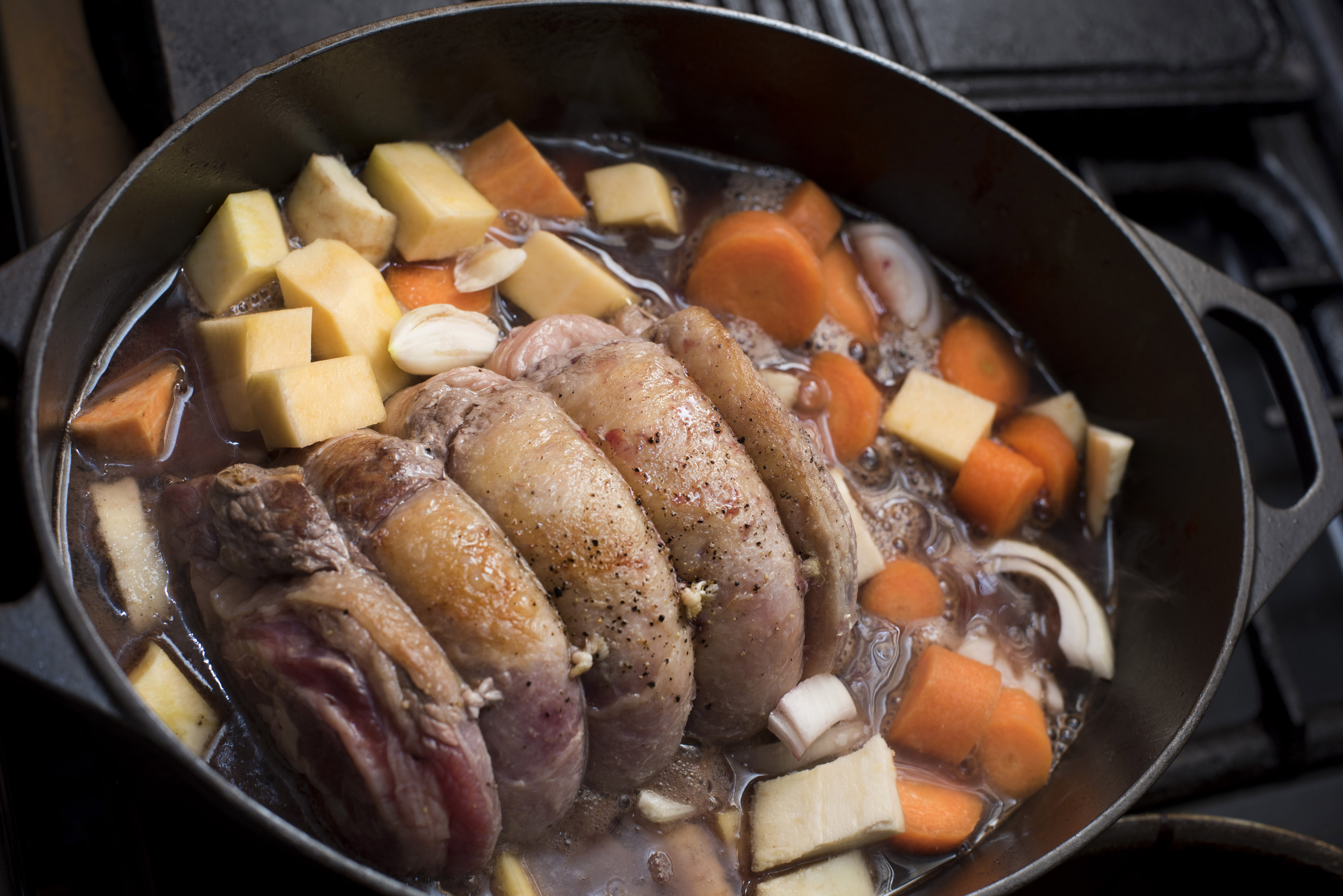 Keywords: cooking, meat, pot, shoulder, simmering, stew, vegetables, beef, food, carrots, onion, casserole, trussed, recipe, closeup