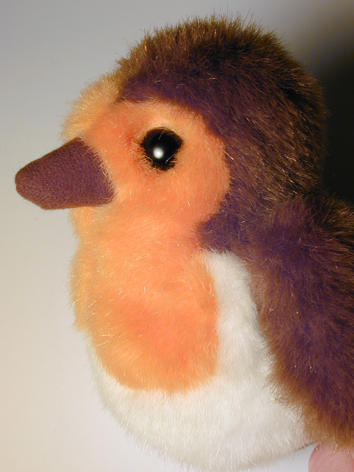 Close up side view of the red breast and head of a soft stuffed toy robin, one of the most popular songbirds in the UK