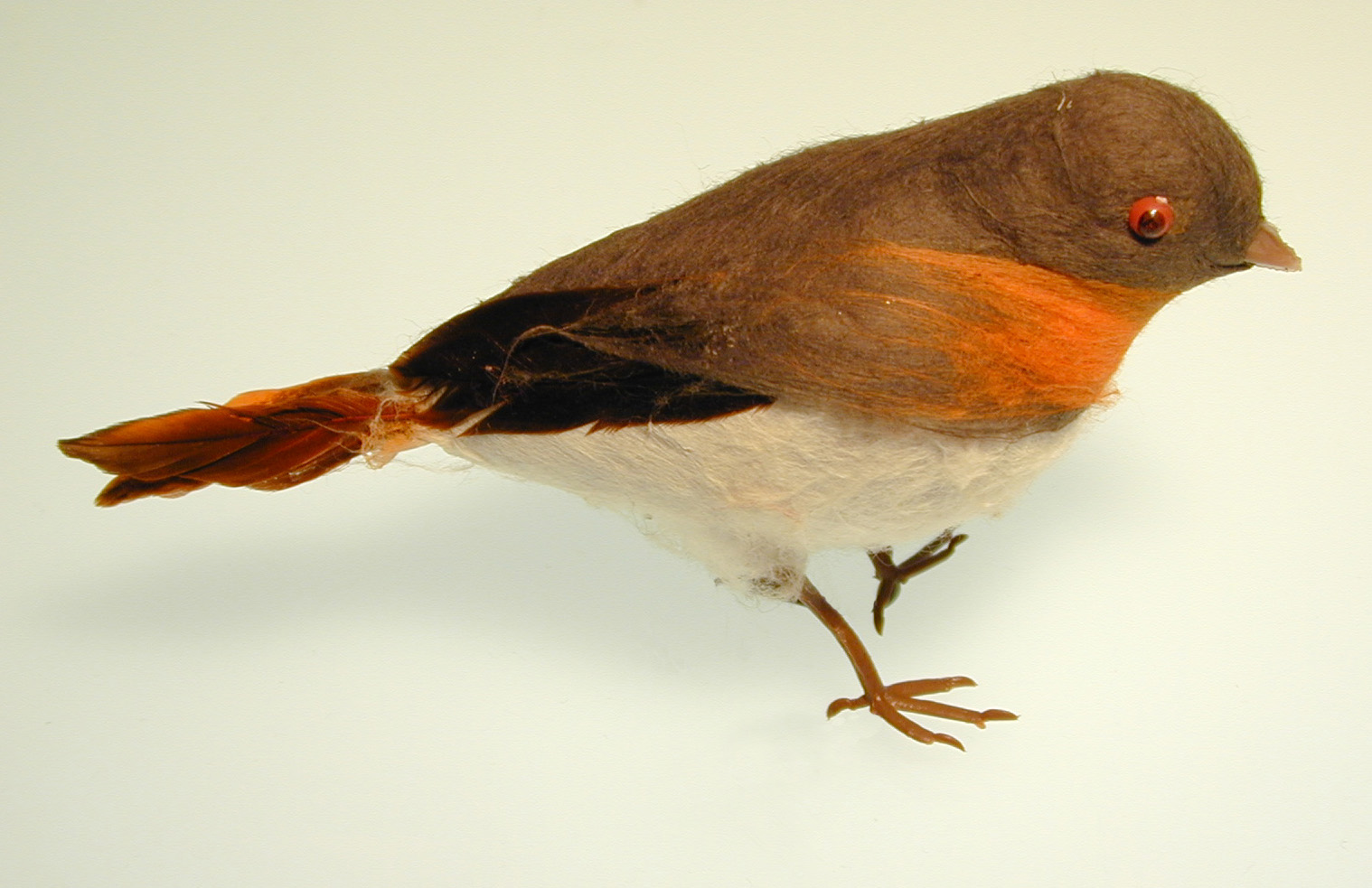 Keywords: animal, bird, fake, imitation, still life, toy, white background, robin, song bird, feathers, above, cut out, isolated, decoration, object
