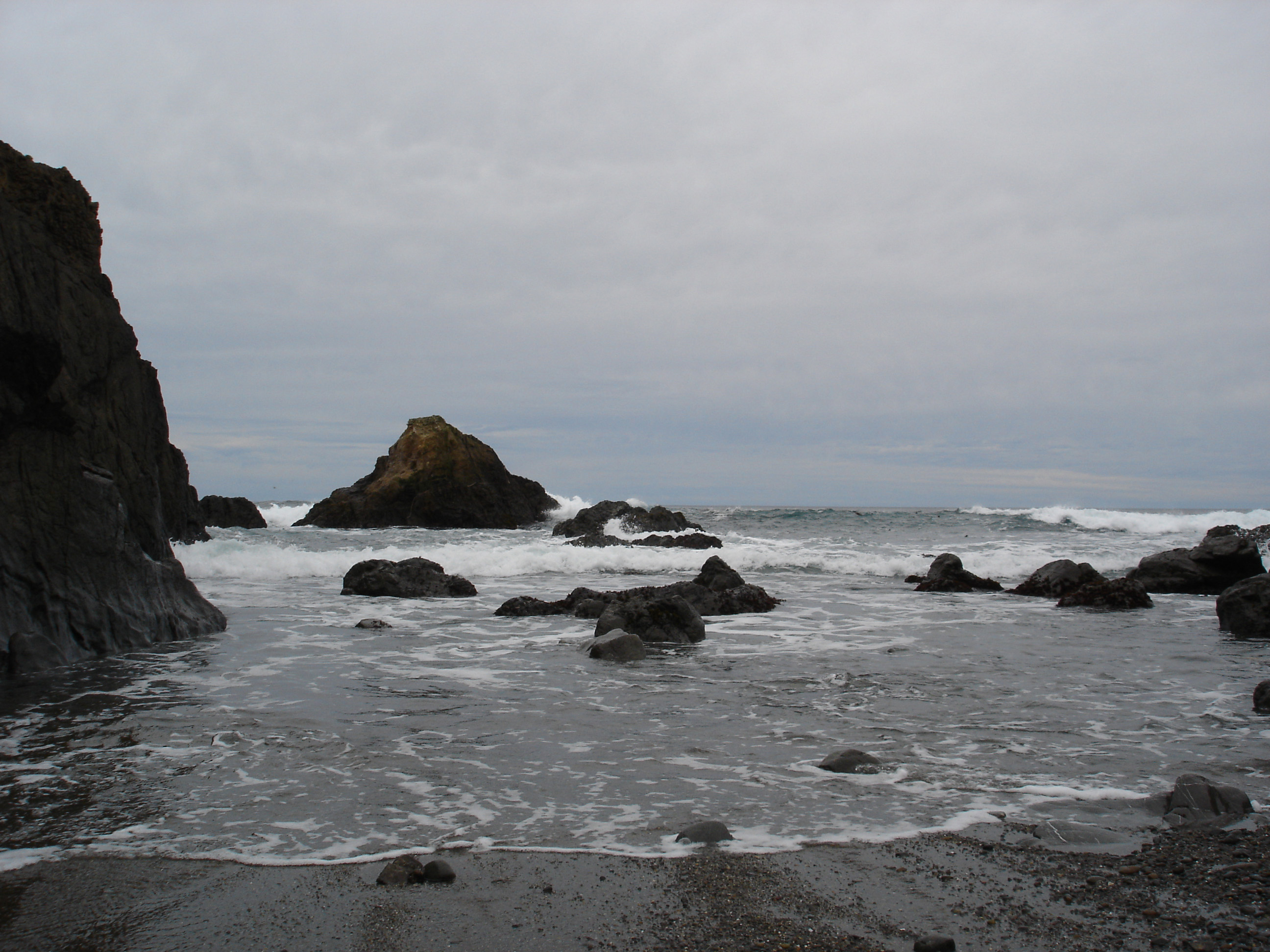 Keywords: travel, landscape, outdoors, rocky, waves, beach, sand, shoreline, coastline, usa, serene, deserted, united states, overcast, california