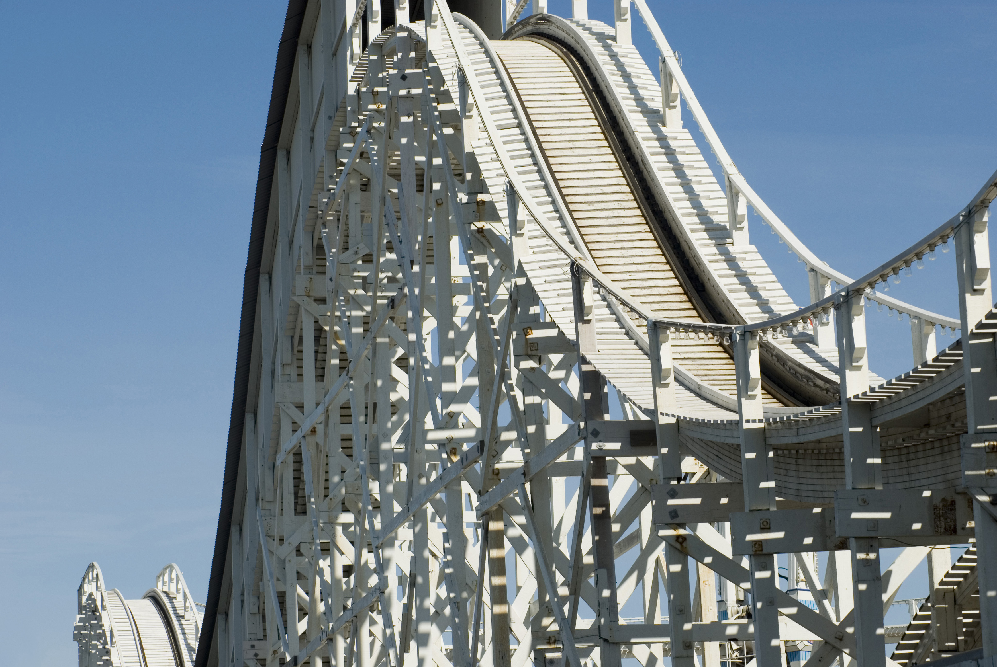 Keywords: amusement, fairground, park, entertainment, ride, carnival, festival, blue sky, big dipper, empty, hill, incline, steep, structure, track