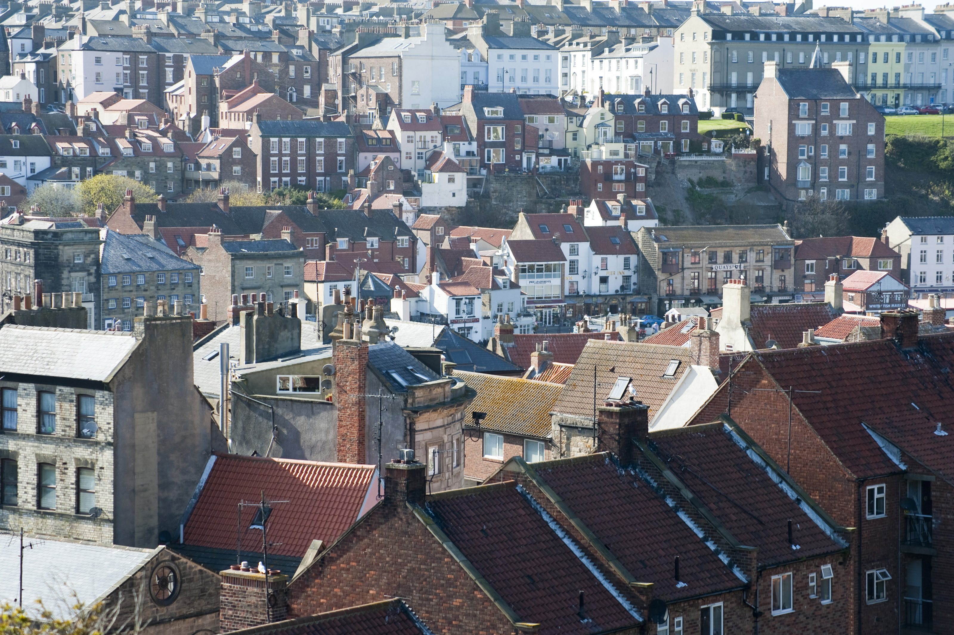 Rooftop view of the architecture and buildings of the historical fishing town of Whitby in North Yorkshire