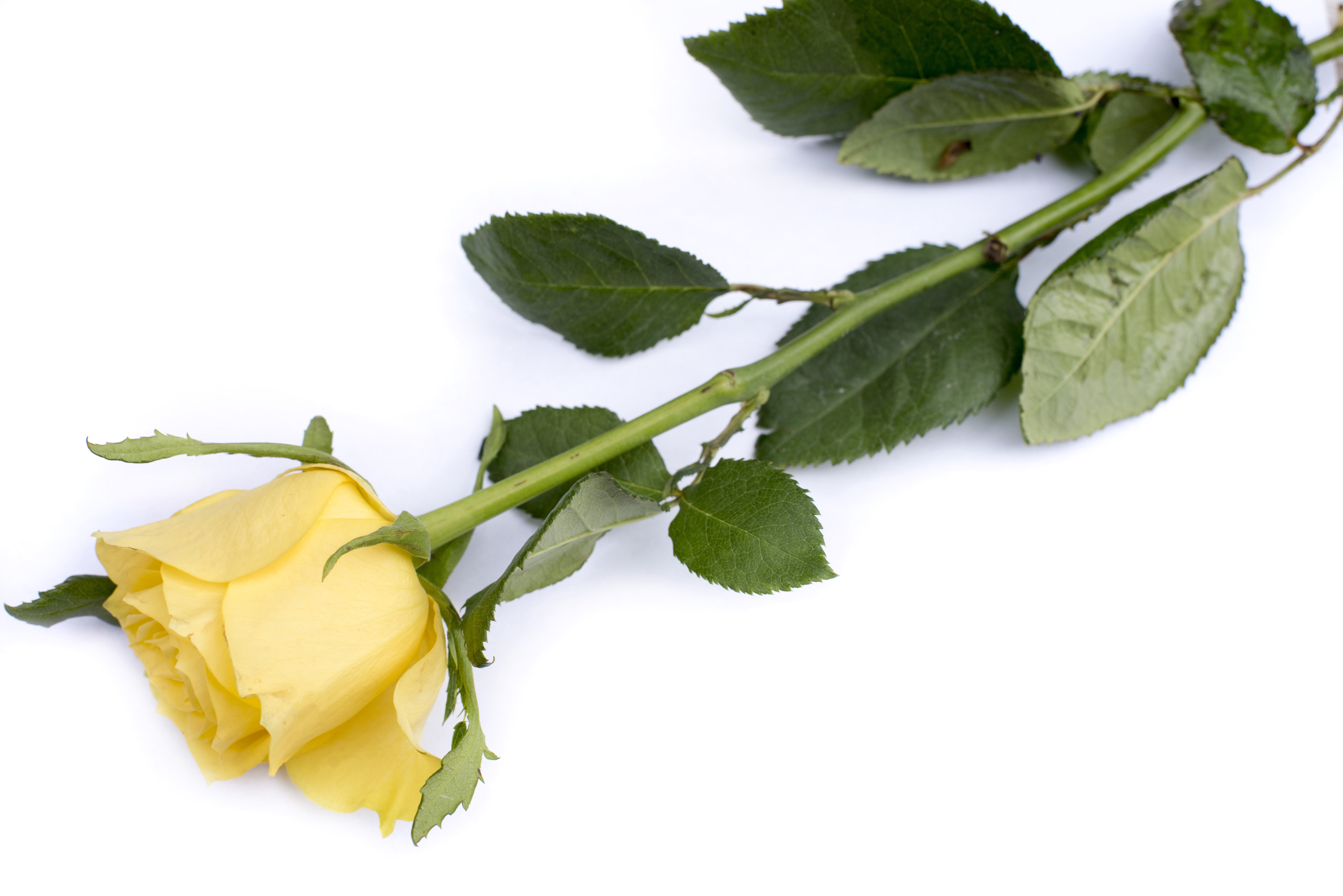 Single yellow rose symbolising love and romance lying diagonally on a white background with copy space for a message to a loved one