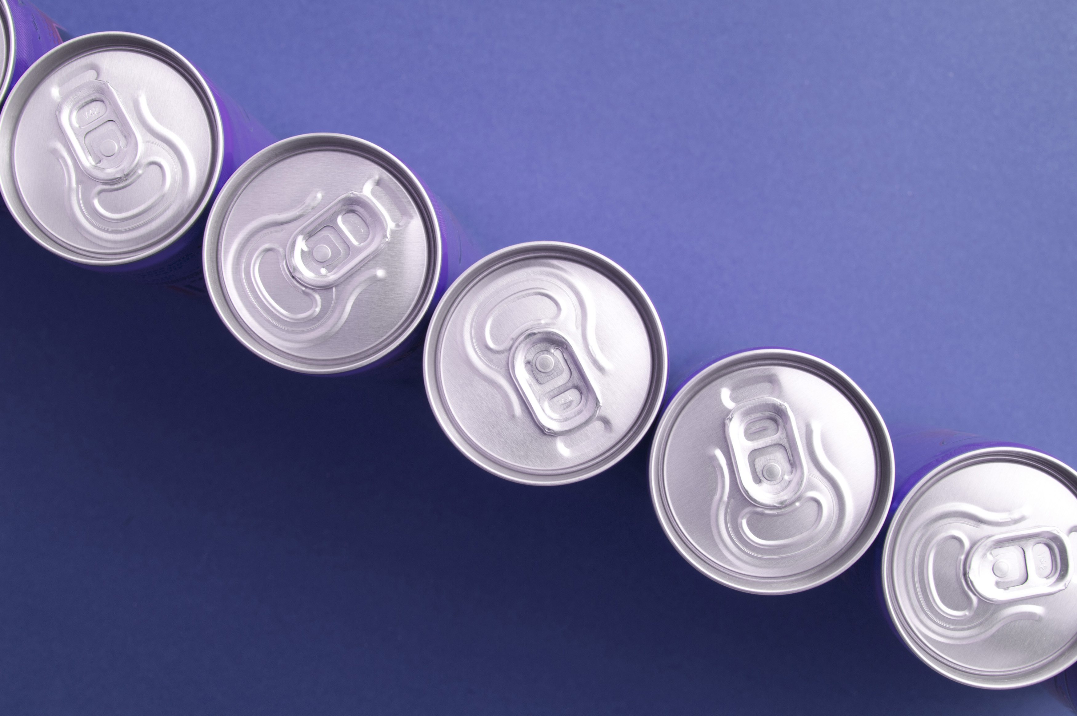 Row of beverage cans arranged in a diagonal line on a blue background, close up overhead view with copyspace